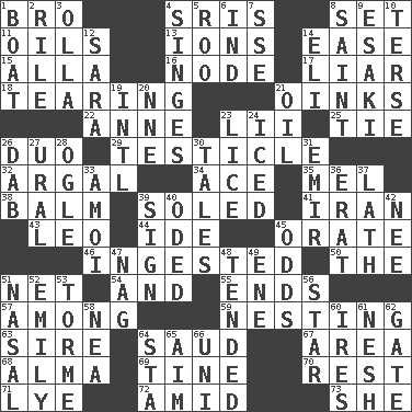 ACROSS 1. Sis' sibling 4. Indian titles of respect 8. Put into a specified state 11. Lubricates 13. Charged particles 14. Comfort 15. Silent film actress Nazimova 16. Thickened enlargement 17. One who doesn't tell the truth 18. Separating forcefully 21. Pig sounds 22. Queen of England 1702-14 23. Cards in a Roman deck? 25. Neckwear 26. Superhero pair 29. One of the two male reproductive glands 32. Therefore, facetiously 34. Adept person 35. Cartoonist voice _ Blanc 38. Lip ointment 39. Having a sole or soles 41. SW Asia republic 43. Lion 44. Binary compound 45. Declaim 46. Swallowed 50. Definite Article 51. Fish or hair follower 54. Added to 55. Extremities 57. Amid 59. Snuggling 63. The founder of a family 64. Saudi Arabian king (1953-1964) 67. Length times width 68. _ mater 69. Prong on a fork 70. State of inaction 71. Sodium hydroxide 72. Among 73. A female animal or person DOWN 1. Water vessel 2. Cause heat under the collar 3. Spanish pot 4. Scorches 5. Friend of Pooh 6. Indiana (abbr.) 7. Compass dir. 8. Virtuous person 9. 1973 Nobel Price Winner (Physics) Leo 10. Laconic 12. "Two Mules for Sister ____" 14. Biblical high priest 19. International (abbr.) 20. Compass dir. 21. Petroleum 23. Louse (plural) 24. On the rocks 26. Pat or tap gently 27. Mountain range 28. Stare 30. Falsehoods 31. Arab leader 33. Mine, in Marseilles 36. Part of Q.E.F. 37. Thin strip of wood or metal 39. Public display of a written message 40. Wrote a lyric poem 42. Born 45. Probability 47. Tired old horse 48. Watched over 49. Compass dir. 51. Relating to the nose 52. Poet Dickinson 53. Singer Mel 56. Play the lead 58. Teachers' org. 60. Angers 61. Soft 62. Yard entry 64. R.R. building 65. Direct toward a target or goal 66. Single; one (prefix)