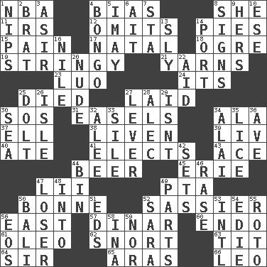 ACROSS 1. Basketball assoc. 4. Prejudice 8. A female animal or person 11. Big collection agency 12. Leaves out 14. Sliced desserts 15. Ache 17. Brizilian seaport 18. Legendary monster 19. Slender, wiry 21. Entertaining tales 23. Nilotic language 24. It is 25. Passed on 27. Put down 30. Distress signal 31. Artist's stands 34. Wing 37. Pipe bend 38. Make or become more lively 39. 54 in ancient Rome 40. Had dinner 41. Opts 43. Adept person 44. Fermented drink made from hops 45. One of the Great Lakes 47. Cards in a Roman deck? 49. Parent Teacher Assoc. 50. Maid-servant 52. More lively and spirited 56. 90 degrees 57. Middle Eastern gold or silver currency 60. Inside; within (prefix) 61. Margarine 62. Derisive sound 63. Teat (slang) 64. Title for a knight 65. Ancient river in northeast Turkey 66. Lion DOWN 1. Cuts off 2. Naughty child 3. SW Saudi Arabia district 4. Beat drum 5. "If ____ say so..." 6. Small island 7. R.R. building 8. Public displays of written messages 9. Possessive pronoun 10. Compass dir. 13. Insidious 14. Sweet dark-red dessert wine 16. The longest river in the world 20. Unadorned 22. Help 25. Dunce 26. Small island 27. Prying instrument 28. Actor Baldwin 29. Is not 30. Ocean 32. Toward shelter 33. Drop; flow; fall 34. Jai ____ 35. Louse (plural) 36. "___ Maria" 42. Puts into a specified state 44. Storage container 46. To erase 47. Failure 48. To the inside or interior of 49. Pieces 50. Indonesian resort city 51. Begley and Asner 52. "Two Mules for Sister ____" 53. International (abbr.) 54. Singer Brickell 55. Printing process, for short 56. Greek goddess of the dawn 58. _ tizzy (2 wds.) 59. Or not