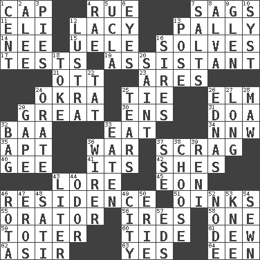 ACROSS 1. Head covering 4. Regret 7. Settles 11. Connecticut Ivy Leaguer 12. Made of lace 13. Chummy 14. Born 15. Ubangi River tributary 16. Finds the solution 17. Trials 19. Helper 21. Baseball player Mel 23. Ancient Greek god of war 24. Gumbo ingredient 25. Make a knot 26. Shade tree 29. Relatively large 30. Followers of ems 31. ___ good deed 32. Sound made by sheep 33. Ingest 34. Compass dir. 35. Fitting 36. Armed conflict 37. Lean end of the neck 40. Unit of force equal to gravity 41. ___ a Wonderful Life 42. "______ My Girl" (Turtles hit) 43. Old wives' tales, e.g. 45. A really long time 46. Home 51. Pig sounds 55. Speaker 56. Angers 58. Single 59. Carrier 60. Periodic rise and fall of the sea level 61. Morning condensation 62. SW Saudi Arabia district 63. It is so 64. Car or cant ending DOWN 1. Penny 2. Toward shelter 3. Sliced desserts 4. Actress Charlotte 5. Southern CA. univ. 6. Sight organs 7. Table seasonings 8. Inventor's middle name 9. Small, secluded valley 10. System (abbr.) 12. A period of five years 13. Airs 16. Fathers 18. Casino tip 20. Virtuous person 22. Make lace 24. Speak pompously 25. Lacerates 26. Ferber et al. 27. Yearn 28. Opening into something insatiable 29. Stare wonderingly 32. Container for groceries 33. Consumed 36. One who wires 37. Compass dir. 38. Elect 39. Painter Guido (1575-1642) 43. 61 cubic inches 44. Scent 46. Roll call or roster of names 47. Greek god of love 48. Suttee (variant) 49. Municipality 50. One of the Great Lakes 52. Thickened enlargement 53. Leg joint 54. Stitched 57. Begley and Asner
