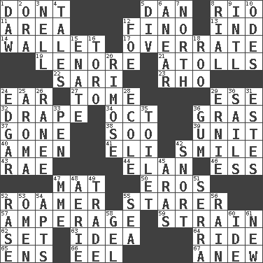 ACROSS 1. Do not 5. Daniel's nick name 8. _ de Janeiro 11. Type of rug 12. A pale, very dry sherry 13. Working for oneself (abbr.) 14. Place for singles 17. Make much ado about nothing 19. Poe poem 21. Ringlike coral islands and reefs 22. Indian skirt 23. 17th letter of the Greek alphabet 24. Hearing organ 27. Heavy book 29. Compass dir. 32. Window treatment 34. Sep. follower 36. Pate de foie ____ 37. Went 38. "Barney Miller" actor Jack 39. A single undivided whole 40. So be it 41. Connecticut Ivy Leaguer 42. Grin 43. Actress Charlotte 44. Enthusiasm 46. Double-curved letter 47. Floor covering 50. Greek god of love 52. Nomad 55. A viewer who gazes fixedly 57. Electrical Measurement 59. Put through a sieve 62. Put into a specified state 63. It may be bright or harebrained 64. Travel on or in a vehicle 65. Followers of ems 66. Snakelike fish 67. Afresh DOWN 1. Obsolete 2. Mouth or opening 3. 1994 drama film starring Jodie Foster 4. Lies 5. HTML Container Element 6. Approach 7. Compass direction 8. Monetary unit of Yemen 9. International (abbr.) 10. Lyric poems 12. Enemy 15. Maternal 16. "Corrida" creature 18. Friend of Pooh 20. Full of chinks, cracks, or crevices 24. _ Allan Poe 25. Odor 26. The wife of a rajah (variant) 28. Learning spot: Fr. 29. Bert's buddy 30. Moves on water 31. _____ Park, CO 33. Animal enclosure 35. Bathroom plumbing fixture 36. Chewing product 42. Derisive sound 45. Caspian sea tributary 47. Madame (abbr.) 48. Nest on high 49. Swap 51. Spanish missionary in California 52. Raze (variant) 53. Sign of something about to happen 54. Tenement units (abbr.) 55. Ocean 56. Precipitation 58. Set 60. Binary compound 61. ___ Haven, CT