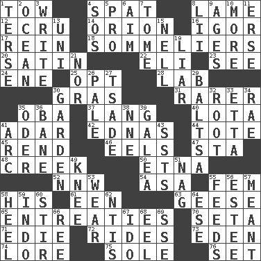 ACROSS 1. Pull behind 4. Argument over a trivial matter 8. Unable to walk 12. Shade of tan 14. Constellation of myth 16. Composer Stravinsky 17. It's straight from the horse's mouth 18. Wine waiters 20. Smooth fabric 22. Connecticut Ivy Leaguer 23. Perceive with the eye 24. Compass dir. 25. Elect 28. Experiment locale 30. Pate de foie ____ 31. More valued for its uncommonness 35. Chief or king in Benin or Nigeria 37. Austrian-born American filmmaker Fritz 40. Globular water bottle used in Asia 41. The sixth month of the Jewish calendar 42. Ferber et al. 44. Lug 45. Tear apart 46. Snakelike fish 47. R.R. building 48. Small stream 50. Inactive volcano in Sicily 52. Compass dir. 54. White ___ sheet 55. Opposite of masc. 58. Part of HMS, perhaps 61. Car or cant ending 63. Honkers 65. Pleas 70. Bristle 71. Singer Brickell 72. Amusement-park features 73. Genesis locale 74. Old wives' tales, e.g. 75. Flatfish 76. Arrange properly for use DOWN 1. Laconic 2. Sea 3. Compose 4. Mayday 5. Adept person 6. Direct toward a target or goal 7. Heavy book 8. Cards in a Roman deck? 9. Ripens 10. Greater amount 11. Celtic language 13. Corn or form start 15. 1994 drama film starring Jodie Foster 19. One who doesn't tell the truth 21. And not 26. Diluted with white 27. Sadhe (variant) 29. Greek mezzo-soprano Agnes 30. Place where plants grow 32. Carrot, for example 33. Singer James 34. Actress Charlotte 35. Baltic tributary 36. Object of repulsion 38. Compass dir. 39. An organ shaped like a helmet 41. Curve 43. Fast planes 49. Leg joint 51. Tired old horse 53. Erode 55. Eats 56. First name in cosmetics 57. Intended 58. Person who is morally reprehensible 59. Southeast Asian peninsula 60. Agitate 62. Nuclear Threat Initiatives 64. Compass dir. 66. To sift 67. Wedding promise 68. Snakelike fish 69. Compass dir.