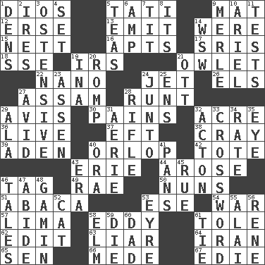 ACROSS 1. "Vaya con ____" 5. Jacques of French films 9. Floor covering 12. Celtic language 13. Give off 14. Past tense of be (plural) 15. Remaining after all deductions 16. Tenement units (abbr.) 17. Indian titles of respect 18. Compass dir. 19. Big collection agency 21. A small or young owl 22. Billionth: prefix 24. _ stream 26. Raised railways 27. Indian state 28. Undersized animal 29. Advice 30. Aches 32. Measure of real estate 36. Moving, as bait 37. Bank Draft (abbr.) 38. Supercomputer manufacturer 39. Arabian gulf 40. Fourth or lowest deck 42. Haul 43. 4th largest of the Great Lakes 44. Came up 46. Label 49. Actress Charlotte 50. Religious women 51. Phillipine bananalike plant 53. Compass dir. 54. Armed conflict 57. Pale green bean 58. Whirlpool 61. Lacquered or enameled metalware 62. Prepare for publication 63. One who doesn't tell the truth 64. SW Asia republic 65. Elected rep. 66. Ancient Persian 67. Singer Brickell DOWN 1. Hiding places for outlaws 2. Angers 3. Clearly or manifestly demonstrative 4. Arrange properly for use 5. Afternoon social gatherings 6. Electrical Unit 7. Teat (slang) 8. ___ a Wonderful Life 9. Haggard of country music 10. Satellite of Uranus 11. Trials 14. Compass dir. 19. _ tizzy (2 wds.) 20. Play 21. Baseball player Mel 23. NE Netherlands city 24. Secret group 25. Followers of ems 27. Enthusiastic 28. Ransack; plunder; pillage 29. In the manner of 31. Nest on high 32. Gambison 33. What you're doing now 34. Assign a rank or rating to 35. Sight organ 40. Mouth or opening 41. Baking dishes 43. Epoch 45. Sorrow 46. Falsehoods 47. Remain 48. Homeless child 52. Feline 53. Jane of fiction 55. Jai _ 56. French philosopher Descartes 58. Shade tree 59. Expire 60. June honoree 61. Neckwear