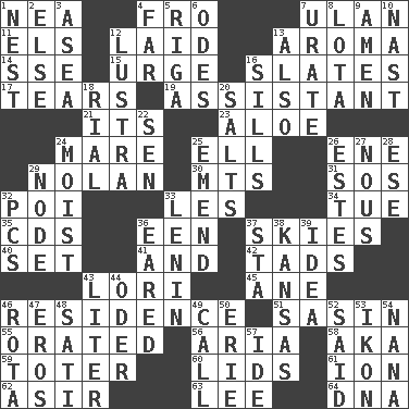 ACROSS 1. Teachers' org. 4. From 7. Uhlan (variant) 11. Raised railways 12. Put down 13. Scent 14. Compass dir. 15. Goad 16. Chalkboards 17. Separates forcefully 19. Helper 21. It is 23. Medicinal plant 24. Female horse 25. Pipe bend 26. Compass dir. 29. Pitcher Ryan 30. Mountains (abbr.) 31. Mayday 32. Luau course 33. French article 34. Third day of the wk. 35. Music discs 36. Car or cant ending 37. Atmospheres 40. Put into a specified state 41. Plus 42. Small boys 43. Australian parrot (variant) 45. One (Scot) 46. Home 51. Indian antelope 55. Declaimed 56. Operatic vocal solo 58. Alias (abbr.) 59. Carrier 60. Flaplike coverings 61. Electrically charged atom 62. SW Saudi Arabia district 63. Area sheltered from the wind 64. Heredity factor (abbr.) DOWN 1. A home for chicks 2. Otherwise 3. Toward the sea 4. At a great distance 5. Capital of Latvia 6. Lyric poems 7. A salt of uric acid 8. Globular water bottle used in Asia 9. So be it 10. Political cartoonist Thomas 12. A period of five years 13. In addition 16. Beverly of Met fame 18. Monetary unit of Yemen 20. Table seasonings 22. Elected rep. 24. Damp 25. Make improvements or corrections to 26. _____ Park, CO 27. Good sense 28. Compass dir. 29. Connecting point 32. Personal Computers (abbr.) 33. Soviet premier 1918-24 36. Having ears or earlike features 37. R.R. building 38. Sunflower state 39. The main thing one is thinking about 43. 61 cubic inches 44. River in Europe 46. Round or rotation of duties 47. Greek god of love 48. Suttee (variant) 49. Give a ring to 50. One of the Great Lakes 52. Alleged 53. Visual representation of an object 54. Grandmother 57. Binary compound