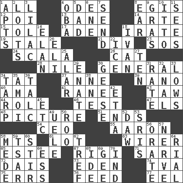 ACROSS 1. Everything 4. Lyric poems 8. Armor plate that protects the chest 12. Luau course 13. Object of repulsion 14. Johnson of "Laugh-In" 15. Lacquered or enameled metalware 17. Arabian gulf 18. Feeling or showing extreme anger 19. Having lost freshness 21. HTML Container Element 23. Mayday 24. Any of the three canals of the cochlea 26. Feline 28. "Death on the ____" 30. Commissioned military rank 34. Make lace 37. Singer Murray 39. Billionth: prefix 40. Wet nurse (var.) 41. The wife of a rajah (variant) 43. The 23rd letter of the Hebrew alphabet 44. Hero or heavy, e.g. 46. Trial 47. Raised railways 48. Photo 51. Extremities 54. Corporate head (abbr.) 55. Composer Copland 58. Mountains (abbr.) 61. Car dealer's back yard 63. One who wires 65. First name in cosmetics 67. Swiss mountan, "Queen of the Mountains" 71. Indian skirt 72. Raised platform 73. Paradise 74. Federal power corp. 75. Blunders 76. Nourish 77. Snakelike fish DOWN 1. Flats, for short 2. Plunders 3. Pale purple color 4. Chief or king in Benin or Nigeria 5. June honoree 6. Compass dir. 7. Transmit 8. Hearing organ 9. Pate de foie ____ 10. "Tell ____ the Marines!" 11. Observes 16. Flair 18. "Terrible" tsar 20. Biblical high priest 22. Frozen water 25. Having or resembling wings 27. Nine, plus one 29. Maternal 30. Honkers 31. Pace 32. Of or related to the anus 33. Coldest temperatures 34. Canvas cover 35. Mine, in Marseilles 36. Baby powder 38. Compass dir. 42. Inactive volcano in Sicily 45. And so on (abbr.) 49. Ubangi River tributary 50. Friend of Pooh 52. Obsolete 53. Indian titles of respect 56. Speak pompously 57. Impudent aggressiveness 58. Ancient Persian 59. Russian ruler of old 60. Use a swizzle stick 62. Not kosher 64. Monetary unit of Yemen 66. Curvy letter 68. Binary compound 69. Turn to the right 70. Indiana (abbr.)