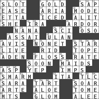 ACROSS 1. Narrow, elongated depression 5. Gilt 9. Plant excrement 12. Relaxation 13. Roberta Peters solo 14. Method 15. Singer James 16. On the rocks 17. Came down and settled, as after flight 18. A female animal or person 19. Lyricist Gershwin 21. Zeal 22. Nanny 24. _-fi 26. Bear (Spanish) 27. Slender Brazilian palm 28. ____ Bator, Mongolia 29. Advice 30. Music written for nine 32. Play the lead 36. Moving, as bait 37. To free from 38. Drink excessively 39. Arabian gulf 40. Soft thread for cleaning between teeth 42. Assign a rank or rating to 43. Within a short period 44. Women servants 46. Cleo's killer 49. Slangy assent 50. Naughty children 51. Excessive but superficial compliments 53. Call ___ day 54. Affectionate concern, for short 57. "Two Mules for Sister ____" 58. Small pie 61. Fly high 62. Johnson of "Laugh-In" 63. _ vera 64. Heavy book 65. Mountains (abbr.) 66. Seize upon or latch onto something 67. Toward shelter DOWN 1. Observes 2. Thin strip of wood or metal 3. Clearly or manifestly demonstrative 4. Beverage made from leaves 5. Greek goddess of the earth (variant) 6. The grampus (Milton) 7. Untruth 8. Male parent 9. Twentieth part of a lira 10. Goodbye (Sp.) 11. Stone: prefix 14. Third mo. 19. _ tizzy (2 wds.) 20. Water falling in drops from the sky 21. The 18th letter of the Arabic alphabet 23. NE Netherlands city 24. Bobsleighs 25. Domesticated feline 27. Enthusiastic 28. The state of being joined or united 29. Chicken ___ king 31. Lowest deck of a ship 32. Long narrow piece of something 33. Inedible or poisonous agaric 34. Tenement units (abbr.) 35. To sift 40. Enemy 41. Stricken, poetically 43. Symbol (abbr.) 45. Nursemaid (var.) 46. Indian state 47. Don Adams' spy role 48. Components 52. Actress Charlotte 53. A whole individual unit 55. Unable to walk 56. Algonquian 58. Label 59. Everything 60. Friend of Pooh 61. R.R. building