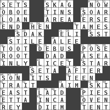 ACROSS 1. Arranges properly for use 5. Heroin 9. Immediately 12. Mitch Miller's instrument 13. Airtight sealed metal containers 14. Fly high 15. Grant temporary use of 16. Type of rug 17. Celtic language 18. Conclusion 19. Layer 21. Domesticates 22. Neighbor of Neb. 24. Connecticut Ivy Leaguer 26. Fast jet (abbr.) 27. Vertical member of a panel or frame 28. Toward shelter 29. A blast of a horn 30. To get out of a bus 32. Airs 36. Carrot, for example 37. June honoree 38. At sea 39. In an inward manner 40. It is permitted: Lat. 42. Play the lead 43. Stalk of a moss capsule 44. Following 46. Male offspring 49. It is 50. Adolescent 51. Distinguishing feature 53. Direct toward a target or goal 54. What Jean-Claude Killy likes to do 57. 90 degrees 58. Put down 61. Sliced desserts 62. Singer James 63. South American Indian 64. Baking chamber 65. Marina Del _, California 66. South Vietnam president (1954) 67. Portable shelter DOWN 1. Not divided or shared with others 2. Inky black, to poets 3. Inedible or poisonous agaric 4. Elected rep. 5. Comedian Laurel of Laurel & Hardy 6. Apertif with cassis 7. A saturated hydrocarbon 8. Girls' org. (abbr.) 9. Typical models 10. Fertile tracts in a desert 11. Obtain by seizing forcibly or violently 14. Ocean 19. Actor Linden 20. Made supply last 21. Neckwear 23. Simple song 24. Evade 25. French article 27. Within a short period 28. Phillipine bananalike plant 29. Three (prefix) 31. Proofreads 32. Thick mixture 33. Clearly or manifestly demonstrative 34. Scorch 35. Hearing organ 40. Allow 41. Jacques of French films 43. Be seated 45. Opposite of masc. 46. Guide 47. Declaim 48. Offensive 52. Call ___ day 53. First man 55. Peachy ____! 56. Is not 58. Flaplike covering 59. Black tropical American cuckoo 60. Frozen water 61. Cooking vessel