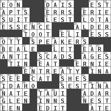 ACROSS 1. Period of immesurable duration 4. Raised platform 8. Eastern Standard Time (abbr.) 11. Flats, for short 13. Blunders 14. One of the Great Lakes 15. Set or collection 16. For fear that 17. Globular water bottle used in Asia 18. Core 21. Tree or shrub in the Birch family 22. A blast of a horn 23. Biblical high priest 25. Double-curved letter 26. Baseball player Mel 29. Orators 32. Calif. Air Force Base 34. Allow 35. Ewer handle 38. Opposed to 39. Oodles 41. Eons 43. Shallow baking pan 44. Ingest 45. Bert's buddy 46. Plea 50. _ tizzy (2 wds.) 51. Perceive with the eye 54. Domesticated feline 55. "______ My Girl" (Turtles hit) 57. Potato state 59. French poetic form 63. Nathan's nickname 64. "Change" in Tahitian 67. The sixth month of the Jewish calendar 68. Small, secluded valley 69. Lodging establishments 70. Egg locale 71. Car or cant ending 72. Prepare for publication 73. Had dinner DOWN 1. Comfort 2. Musical composition 3. Nuclear Threat Initiatives 4. Erase 5. "We ___ not amused" (Victoria) 6. Big collection agency 7. Fast jet (abbr.) 8. Eat (away) 9. Settings 10. Pulls apart 12. Proofreading order 14. Pipe bend 19. Characteristic smell of wine 20. Police officer (slang) 21. Atmosphere 23. Made supply last 24. Allows 26. Chief or king in Benin or Nigeria 27. Portable shelter 28. Jacques of French films 30. Having winglike extensions 31. Singe 33. Actor's bit 36. Hindu god of fire 37. It's straight from the horse's mouth 39. Stalk of a moss capsule 40. Haul 42. Ocean 45. Snake ____ (dice throw) 47. Non-commissioned officer (abbr.) 48. Aid 49. Definite Article 51. Scorch 52. Peak District village in England 53. Consumed 56. Comedian Laurel of Laurel & Hardy 58. Layer 60. The main thing one is thinking about 61. Political cartoonist Thomas 62. Johnson of "Laugh-In" 64. Make a knot 65. Added to 66. Corn or form start