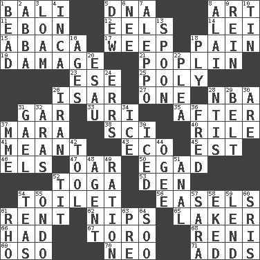 ACROSS 1. Indonesian resort city 5. Heredity factor (abbr.) 8. Tate display 11. Inky black, to poets 12. Snakelike fish 14. Luau accessory 15. Phillipine bananalike plant 17. Shed a tear 18. Ache 19. Break 21. Cotton for raincoats, e.g. 23. Compass dir. 25. More than one (prefix) 26. Austrian river, tributary to the Danube 27. Single 28. Basketball assoc. 31. Slender fish 33. RI univ. 35. Following 37. Hindu Mythology: god of death 38. _-fi 40. Cause heat under the collar 41. Intended 43. Environmental prefix 45. Eastern Standard Time (abbr.) 46. Raised railways 47. Boat paddle 50. Mild oath 52. Ancient Roman robe 53. Lair 54. Bathroom plumbing fixture 56. Artist's stands 61. Monthly bill 62. Cuts off 65. Member of a famous L.A. basketball team 66. Possessed 67. "Corrida" creature 68. Painter Guido (1575-1642) 69. Bear (Spanish) 70. Modern: prefix 71. Sums up DOWN 1. Necklace unit 2. Swedish rock group 3. Rich soil 4. South American Indian 5. Morning condensation 6. Born 7. City in Syria 8. Jai ____ 9. It's straight from the horse's mouth 10. Shallow baking pan 13. Soup utensil 16. Matures 18. Strand of rope, yarn or thread 20. He sold his birthright 22. Entreaty 24. Blunders 26. SW Asia republic 28. Nuclear Threat Initiatives 29. Waist strap 30. "We ___ not amused" (Victoria) 31. Highlander 32. Ancient river in northeast Turkey 34. Frozen water 36. Flintstone 37. Madame (abbr.) 39. On the rocks 42. Instrument 44. Double curve, resembling the letter S 48. Rep 49. Food allowance for one day 51. Of or related to the anus 52. Teat (slang) 54. Afternoon social gatherings 55. Southwest Nigerian state 57. "Two Mules for Sister ____" 58. Made supply last 59. Grant temporary use of 60. Indian titles of respect 61. 17th letter of the Greek alphabet 63. Before (prefix) 64. "Barney Miller" actor Jack