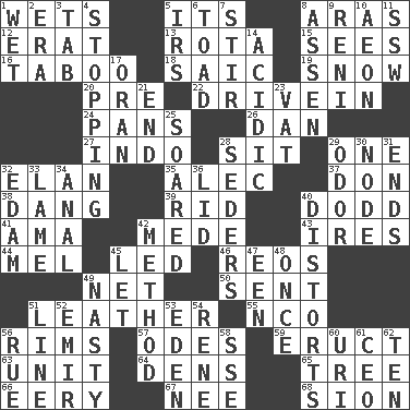 ACROSS 1. Soaks 5. It is 8. Caspian sea tributary 12. Part of Q.E.F. 13. Roll call or roster of names 15. Perceives with the eye 16. Off limits 18. Ketch in the Levant 19. Frozen precipitation 20. Before (prefix) 22. Popular '50s hangout 24. Baking dishes 26. Daniel's nick name 27. Southeast Asian peninsula 28. Be seated 29. Single 32. Style 35. Actor Baldwin 37. Spanish title 38. Mild oath, euphamism for damn 39. To free from 40. Texas town _ City 41. Housemaid (var.) 42. Ancient Persian 43. Angers 44. Cartoonist voice _ Blanc 45. Directed 46. Vintage cars 49. Fish or hair follower 50. Posted 51. Cordwainer's material 55. Non-commissioned officer (abbr.) 56. Basketball hoops 57. Lyric poems 59. Spew [out] 63. A single undivided whole 64. Cub Scout units 65. Woody plant 66. Suggestive of the supernatural 67. Born 68. The Jewish people; Israel DOWN 1. Soggy 2. Epoch 3. Keyboard key 4. Constricting 5. Big collection agency 6. Frog relative 7. Disorderly outburst 8. NE Netherlands city 9. Painter Guido (1575-1642) 10. A really long time 11. Compass dir. 14. Being or containing an acid 17. NW Algerian seaport 21. Conclusion 23. Large container 25. Flew 28. Spring feasts 29. Scent 30. Connecting point 31. Extremities 32. Dutch treat 33. Unable to walk 34. Of or related to the anus 36. Flaplike covering 40. What propaganda does 42. Mode 45. Allow 47. Car or cant ending 48. At one time in the past 49. Offensive 51. Actor's bit 52. Arab leader 53. Genesis locale 54. French philosopher Descartes 56. Sorrow 58. Compass dir. 60. RI univ. 61. Corporate head (abbr.) 62. "___ Little Indians"