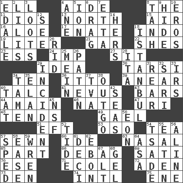 ACROSS 1. Pipe bend 4. Helper 8. Definite Article 11. "Vaya con ____" 13. _ pole 15. Atmosphere 16. _ vera 17. Maternal 18. Southeast Asian peninsula 19. 61 cubic inches 21. Slender fish 22. "______ My Girl" (Turtles hit) 23. Double-curved letter 24. Naughty child 27. Be seated 29. The content of cognition 30. Tarsus (plural) 34. "___ Little Indians" 36. "Tell ____ the Marines!" 39. Approach 40. Baby powder 41. Mole, birthmark 43. Oblong pieces of solid material 44. At full speed 46. Nathan's nickname 47. RI univ. 48. Looks after 49. Highlander 51. Newt 53. Bear (Spanish) 54. Beverage made from leaves 57. Stitched 60. Binary compound 63. Relating to the nose 65. Role in a play 66. Debunk (Brit. slang) 69. Suttee (variant) 70. Compass dir. 71. Learning spot: Fr. 72. Arabian gulf 73. Lair 74. International (abbr.) 75. Compass dir. DOWN 1. Peak District village in England 2. Ms. Damita and namesakes 3. Plunders 4. A saturated hydrocarbon 5. Electrically charged atom 6. To trail on the ground 7. Singer James 8. Hyperbolic tangent 9. Flintstone garb 10. Greek god of love 12. Observe 14. Possessive pronoun 18. Byzantium, centuries later 20. To free from 25. Count _ (2 wds.) 26. Eucharist need 28. Call ___ day 29. Event 31. Posterior 32. Indian skirt 33. Big collection agency 34. Docile 35. Style 37. Federal power corp. 38. Expenditure 40. Make lace 42. Oceans 45. Science/research agcy. 50. Age 52. Periodic rise and fall of the sea level 54. Sadhe (variant) 55. Eroded 56. Place in a line 57. Broke a traffic law 58. Comfort 59. Songbird 61. Tenth: prefix 62. Inky black, to poets 64. White ___ sheet 67. The first octave above the treble staff 68. Set