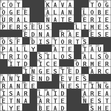 ACROSS 1. Small bed 4. Polynesian shrub of the pepper family 8. Coat; cloak 11. Double curve, resembling the letter S 13. Actor Alda or Thicke 14. Ear part 15. Mountain range 16. Nathan's nickname 17. 4th largest of the Great Lakes 18. Son of Zeus who helped slay Medusa 21. Citrus fruits 22. Pulitzer Prize-winning author Ferber 23. Actress Charlotte 25. Compass dir. 26. Order of Saint Francis (abbr.) 29. What propaganda does 32. Friendly 34. Had dinner 35. The 19th letter of the Greek alphabet 38. Musical group of three 39. Grain storage towers 41. In addition 43. It would 44. Frozen water 45. Abalone 46. Swallowed 50. Curve 51. Cuckoo 54. Conclusion 55. Nights before holidays 57. Indian princess (variant) 59. Snuggling 63. Austrian river, tributary to the Danube 64. Put down 67. Type of rug 68. Inactive volcano in Sicily 69. Johnson of "Laugh-In" 70. A home for chicks 71. Potassium hydroxide 72. Necklace unit 73. A female animal or person DOWN 1. Overturn; upset 2. Legendary monster 3. Pull into pieces 4. Sunflower state 5. In the manner of 6. Large container 7. One (Scot) 8. Singer Mel 9. Off-Broadway awards 10. Honkers 12. Otherwise 14. Luau accessory 19. Whirlpool 20. Corn or form start 21. Allow 23. Printing process, for short 24. Ancient Greek god of war 26. Elect 27. Indian skirt 28. Secret move to avoid paying debts 30. Falsehoods 31. Play the lead 33. Farming town in central California 36. _ mater 37. One who uses or employs something 39. Signal 40. On the rocks 42. The grampus (Milton) 45. Lyric poems 47. Born 48. Looked after 49. Night before a holiday 51. Satellite of Uranus 52. Smutty 53. Silly 56. Comedian Laurel of Laurel & Hardy 58. Period 60. Angers 61. Soft 62. Yard entry 64. Experiment locale 65. "We ___ not amused" (Victoria) 66. Call ___ day