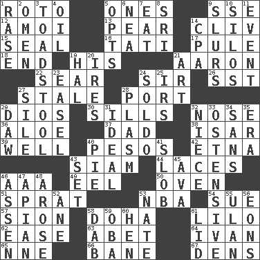 ACROSS 1. Printing process, for short 5. Singles 9. Compass dir. 12. Mine, in Marseilles 13. Lightbulb-shaped fruit 14. 154 in Roman numerals 15. Lick closed 16. Jacques of French films 17. Whine 18. Conclusion 19. Part of HMS, perhaps 21. Composer Copland 22. Scorch 24. Title for a knight 26. Fast jet (abbr.) 27. Showing deterioration from age 28. Sweet dark-red dessert wine 29. "Vaya con ____" 30. Beverly of Met fame 32. Sense of smell 36. _ vera 37. June honoree 38. Austrian river, tributary to the Danube 39. Water source 40. Mexican monetary units 42. Inactive volcano in Sicily 43. Thailand, formerly 44. Shoestrings 46. Auto club (abbr.) 49. Snakelike fish 50. Baking chamber 51. Small fatty European fish 53. Basketball assoc. 54. Institute legal proceedings 57. The Jewish people; Israel 58. Capital of the state of Qatar 61. _ and Stitch 62. Relaxation 63. Collude with 64. "Terrible" tsar 65. Compass dir. 66. Object of repulsion 67. Cub Scout units DOWN 1. Raze (variant) 2. Sign of something about to happen 3. Inedible or poisonous agaric 4. Lubricate 5. Elects 6. Teachers' org. 7. Ingest 8. Indian title of respect (Mr.) 9. Runs notes together 10. Grain storage towers 11. Happening 14. Tax preparer (abbr.) 19. Actor Linden 20. Angers 21. Tate display 23. Artist's stand 24. Twentieth part of a lira 25. Big collection agency 27. Filth; sediment 28. Suffix with ecto or cyto 29. Fool 31. Perfect 32. Sibling's daughter 33. Clearly or manifestly demonstrative 34. Without 35. Epoch 40. Sliced dessert 41. Oscar Madison type 43. Put into a specified state 45. Actress Gardner 46. NE Netherlands city 47. Bee-related 48. Came up 52. One (Scot) 53. Nathan's nickname 55. ____ Bator 56. Immeasurably long periods of time 58. Apply (a substance) by light strokes 59. Chief or king in Benin or Nigeria 60. Layer 61. Hat (slang)