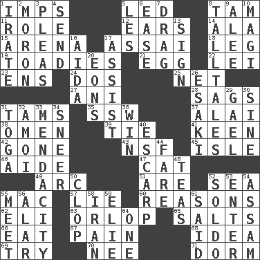 ACROSS 1. Naughty children 5. Directed 8. Scottish cap 11. Hero or heavy, e.g. 12. Hearing organs 14. Insect wing 15. Sports stadium 17. Slender Brazilian palm 18. Part of a journey 19. Sycophants 21. Ovum 22. Luau accessory 23. Followers of ems 24. Two (Sp.) 25. Fish or hair follower 27. Cuckoo 28. Settles 31. Scottish caps 35. Compass dir. 37. Mountain range southwest of Kyrgyzstan 38. Presage 39. Make a knot 41. Peachy ____! 42. Went 43. Science/research agcy. 45. Small island 46. Helper 47. Feline 49. Curve 51. "We ___ not amused" (Victoria) 52. Ocean 55. Apple computer (short form) 57. Whopper 60. Thinks logically 62. Connecticut Ivy Leaguer 63. Lowest deck of a ship 65. Table seasonings 66. Consume 67. Ache 68. It may be bright or harebrained 69. Attempt 70. Born 71. Dormintory (informal) DOWN 1. Feeling or showing extreme anger 2. Person of subnormal intelligence 3. Entreaties 4. Post 5. French article 6. Relaxation 7. To draw with force 8. Baron Munchausen's specialties 9. Toward shelter 10. Wise men 13. Omen 16. Opera by Verdi 17. Help 20. Immeasurably long periods of time 26. 1973 Nobel Price Winner (Physics) Leo 29. Highlander 30. Trig term 31. Ancient Roman robe 32. Mine, in Marseilles 33. Ananias' fault 34. Contemptuous expression 36. Victory 40. Fortification 44. Conductor's collection 48. Beverages made from leaves 50. Hoof sound 52. Twentieth part of a lira 53. Keyboard key 54. Indian state 55. Confront 56. Having or resembling wings 58. SW Asia republic 59. Writer Wiesel 61. Stated 64. Single
