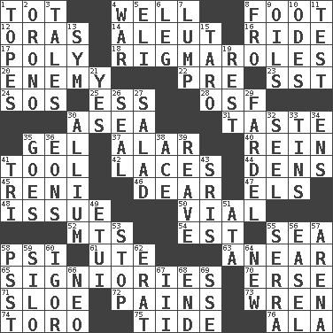 ACROSS 1. Small child 4. Water source 8. Lowest support of a structure 12. Mouths or openings 14. Eskimo relative 16. Travel on or in a vehicle 17. Much (prefix) 18. Complicated, petty procedures 20. Foe 22. Before (prefix) 23. Fast jet (abbr.) 24. Distress signal 25. Double-curved letter 28. Order of Saint Francis (abbr.) 30. At sea 31. Clothes sense 35. Set 37. Having or resembling wings 40. It's straight from the horse's mouth 41. Utensil 42. Shoestrings 44. Lairs 45. Painter Guido (1575-1642) 46. Letter starter 47. Raised railways 48. Come out of 50. Small bottle 52. Mountains (abbr.) 54. Eastern Standard Time (abbr.) 55. Ocean 58. 23rd letter of the Greek alphabet 61. Shoshoni 63. Approach 65. Seigniories (variant) 70. Celtic language 71. A type of plum 72. Aches 73. Songbird 74. "Corrida" creature 75. Event that recurs at intervals 76. Wing DOWN 1. Drinks excessively 2. U. of Maine site 3. Lies 4. Armed conflict 5. Biblical high priest 6. Part of a journey 7. Mass 8. Away 9. Lubricates 10. Lyric poems 11. Trial 13. Symbol (abbr.) 15. Edible starchy tuberous root 19. State of inaction 21. Affirmative reply 26. Lick closed 27. First course 29. Burden 30. Plant genus of onion and garlic 32. Sew up the eyelids of hawks and falcons 33. Airtight sealed metal containers 34. Followers of ems 35. Travels 36. Immeasurably long periods of time 38. Adept person 39. Rob, plunder, or pillage 41. Three (prefix) 43. Indian titles of respect 49. Needle case 51. "One Day ___ Time" 53. Discontinue 55. Spanish missionary in California 56. Artist's stand 57. Sports stadium 58. Inconspicuous attention getter 59. Grain storage tower 60. Russian composer Stravinsky 62. Part of Q.E.F. 64. ___ Haven, CT 66. Modern: prefix 67. One more than two 68. Conclusion 69. Compass dir.