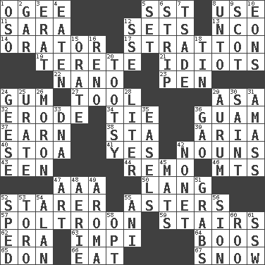 ACROSS 1. Double curve, resembling the letter S 5. Fast jet (abbr.) 8. Purpose 11. "Two Mules for Sister ____" 12. Arranges properly for use 13. Non-commissioned officer (abbr.) 14. Speaker 17. Ski resort town in Vermont 19. Cigar-shaped 21. Foolish or stupid persons 22. Billionth: prefix 23. Writing instrument 24. Chewing product 27. Instrument 29. White ___ sheet 32. Wear away 34. Make a knot 36. Island territory of the United States 37. Merit 38. R.R. building 39. Operatic vocal solo 40. Portico 41. Consenting reply 42. Parts of speech 43. Car or cant ending 44. San ____ (Riviera town) 46. Mountains (abbr.) 47. Auto club (abbr.) 50. Austrian-born American filmmaker Fritz 52. A viewer who gazes fixedly 55. Michaelmas daisies 57. Coward 59. Flight of steps 62. Period 63. Body of Kaffir warriors 64. Expressions of contempt or scorn 65. Spanish title 66. Consume 67. Overwhelm DOWN 1. Bear (Spanish) 2. Slender fish 3. Part of Q.E.F. 4. Consumed 5. Put into a specified state 6. Empty completely 7. Sadhe (variant) 8. To (old English) 9. Native of Scotland 10. Immeasurably long periods of time 12. Compass dir. 15. Declaim 16. Western Nevada city 18. Metal container 20. Tootsie (variant) 24. Honkers 25. A salt of uric acid 26. Person of subnormal intelligence 28. 61 cubic inches 29. Gold (Symbol: Au) 30. Inhabitant of Heaven 31. Collect or gather 33. Heredity factor (abbr.) 35. Artist's stands 36. E Mali city 42. Music written for nine 45. Floor protectors 47. Nonscientific branch of learning 48. Nest on high 49. Odor 51. Seizes 52. Drove too fast 53. "Corrida" creature 54. Actor Alda or Thicke 55. Cuckoo 56. The Jewish people; Israel 58. Elect 60. Friend of Pooh 61. Compass dir.