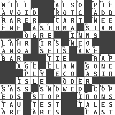 ACROSS 1. Place where flour is made 5. In addition 9. Sliced dessert 12. Shun 14. College mil. group 15. Increase 16. More valued for its uncommonness 17. Draw slowly or heavily 18. Born 19. Compass dir. 20. Respiratory problem 23. Comedian Laurel of Laurel & Hardy 24. Legendary monster 25. Taverns 27. Cowardly lion portrayer 30. Big collection agency 32. Modern: prefix 33. Small Philippine buffalo 34. Arranges properly for use 36. Deep reverence 38. Soap unit 39. Standoff 40. Hit sharply and swiftly 43. Mature 46. Enthusiasm 48. Went 49. Apply oneself diligently 51. Environmental prefix 52. SW Saudi Arabia district 53. Capri or Wight 54. Baltic tributary 56. Backtalk 58. Overwhelmed 61. Police officer (slang) 64. Begley and Asner 65. Discontinue 66. Removes the wrinkles 68. The 19th letter of the Greek alphabet 69. Trial 70. Falsehoods 71. "We ___ not amused" (Victoria) 72. Ancient Greek god of war 73. 90 degrees DOWN 1. Female horse 2. _ the terrible 3. Old wives' tales, e.g. 4. Whopper 5. Bowlike part 6. Rich soil 7. Put through a sieve 8. Sep. follower 9. Leg coverings 10. It may be bright or harebrained 11. Genesis locale 13. To be drawn or hauled along 21. Indian titles of respect 22. Cigar-shaped 23. Overwhelm 24. Mouth or opening 26. Teachers' org. 27. Experiment locale 28. Santa ___, CA 29. Israeli folk dance 31. Vertical member of a panel or frame 35. Manatee 37. Greek god of love 41. Black tropical American cuckoo 42. For each 44. Global Positioning Systems (abbr.) 45. Pipe bend 47. Connecting point 48. Slender fish 50. Last past 53. Come out of 55. Prepare for publication 56. Bristle 57. The sixth month of the Jewish calendar 59. Olfactory organ 60. Elects 61. Root beer relative 62. Washington bills 63. Inconspicuous attention getter 65. R.R. building 67. Actress Charlotte