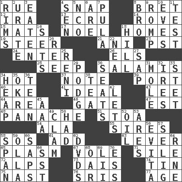 ACROSS 1. Sorrow 4. Fastener 8. Cy Young winner Saberhagen 12. Lyricist Gershwin 13. Shade of tan 14. Be footloose 15. Floor protectors 17. Christmas carol 18. Residences 19. Guide 21. Black tropical American cuckoo 23. Pacific Standard Time (abbr.) 24. Keyboard key 26. Raised railways 28. Ooze 30. Deli grouping 34. Being at a high temperature 37. Short letter 39. Sweet dark-red dessert wine 40. Make supply last 41. Standard of perfection 43. Area sheltered from the wind 44. Type of rug 46. Yard entry 47. Eastern Standard Time (abbr.) 48. Flamboyance 51. Portico 54. Chicken ___ king 55. Titles for men of rank and authority 58. Mayday 61. Say or write further 63. Prying instrument 65. Suffix with ecto or cyto 67. Grand slam 71. Filth; sediment 72. High mountains 73. Raised platform 74. Shallow baking pan 75. Political cartoonist Thomas 76. Indian titles of respect 77. Personal question DOWN 1. Basketball hoops 2. A salt of uric acid 3. Eroded 4. Elected rep. 5. Non-commissioned officer (abbr.) 6. "We ___ not amused" (Victoria) 7. Monetary unit of Botswana 8. Sis' sibling 9. Frolic 10. Nights before holidays 11. Trial 16. Arranges properly for use 18. Land elevation 20. Portuguese money of account (variant) 22. Teachers' org. 25. Painter Guido (1575-1642) 27. Plant excrement 29. Puddle 30. Theater features 31. Undercover agent 32. Angers 33. Proofreading order 34. Pile 35. Gumbo ingredient 36. Adolescent 38. Beverage made from leaves 42. Allows 45. American Automobile Association (abbr.) 49. Burrowing marine mollusk 50. Possessed 52. Petroleum 53. Ancient Greek god of war 56. Webber/Rice musical 57. Former Milwaukee Brewers owner Bud 58. Connect, as a bridge 59. Water jar 60. Plant excrements 62. Movie discs 64. French philosopher Descartes 66. Fast jet (abbr.) 68. Boat paddle 69. Cards in a Roman deck? 70. Curvy letter