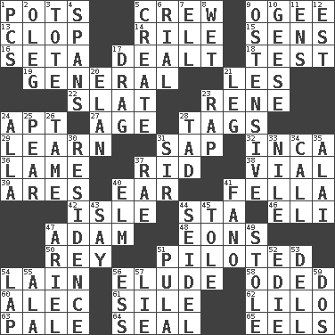ACROSS 1. Cooking vessels 5. Ship's personnel 9. Double curve, resembling the letter S 13. Hoof sound 14. Cause heat under the collar 15. Elected reps. 16. Bristle 17. Started a card game 18. Trial 19. Commissioned military rank 21. French article 22. Narrow board 23. French philosopher Descartes 24. Fitting 27. Grow older 28. Labels 29. Memorize 31. Plant excrement 32. South American Indian 36. Unable to walk 37. To free from 38. Small bottle 39. Ancient Greek god of war 40. Hearing organ 41. Chap (slang) 42. Small island 44. R.R. building 46. Biblical high priest 47. First man 48. Immeasurably long periods of time 50. Marina Del _, California 51. Manned the helm 54. (Had) reclined 56. Evade 58. Wrote a lyric poem 60. Actor Baldwin 61. Filth; sediment 62. _ and Stitch 63. Light colored 64. Lick closed 65. Snakelike fish DOWN 1. Personal Computers (abbr.) 2. Cassini of fashion 3. Carry 4. Connects, as a bridge 5. Cause to be 6. Monetary unit of Yemen 7. Pipe bend 8. Soggy 9. Clearly or manifestly demonstrative 10. Honkers 11. Followers of ems 12. Eastern Standard Time (abbr.) 17. To be drawn or hauled along 20. Style 21. Part of a journey 23. Reproach for some lapse or misdeed 24. Silent film actress Nazimova 25. Lightbulb-shaped fruit 26. Not wild 28. Small amount or degree 30. Dwelling 31. Title for a knight 33. Mediterranean tributary 34. Give a ring to 35. Jai _ 37. Actress Charlotte 40. Shade tree 41. Papal veil 43. Declare 44. A glass for beer 45. Lacquered or enameled metalware 47. Satellite of Uranus 49. Fur scarf 51. Monetary unit of Botswana 52. Singer Brickell 53. Small valley 54. Pet locale 55. Chicken ___ king 56. Curvy letter 57. Untruth 59. Two (Sp.)