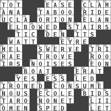 ACROSS 1. Small child 4. Relaxation 8. Burrowing marine mollusk 12. Santa ___, CA 13. Off limits 14. Travel on or in a vehicle 15. Southern CA. univ. 17. Constellation of myth 18. Enthusiasm 19. Turned at an angle; bent 21. Flight of steps 23. Nervous spasm 24. Lair 26. ___ a Wonderful Life 27. Electrical Unit 28. Jane of fiction 30. Cartoonist voice _ Blanc 31. Turn aside suddenly 34. Three (prefix) 37. Actress Charlotte 38. Collection of objects 39. Friend of Pooh 40. Big collection agency 41. Annoying sounds 42. Period of immesurable duration 43. Water vessel 44. Part of Q.E.F. 46. It is so 47. Curvy letter 50. Directed 51. Pressed 54. Ingest 57. Horse sense 58. Learning spot: Fr. 60. Auction offers 62. Edible starchy tuberous root 63. Music written for nine 64. Cards in a Roman deck? 65. Presage 66. Broke a traffic law 67. Allow DOWN 1. The 19th letter of the Greek alphabet 2. Single time 3. Baron Munchausen's specialties 4. Having ears or earlike features 5. Stay 6. "Barney Miller" actor Jack 7. Immeasurably long periods of time 8. Make 9. Ms. Damita and namesakes 10. The sixth month of the Jewish calendar 11. Not women's 13. Pull behind 16. "This won't hurt ____!" 20. Sep. follower 22. Become fatigued 25. Impudent aggressiveness 27. Erode 29. Jacques Cousteau's middle name 30. Medical imaging device (abbr.) 31. Portico 32. Compose 33. Greek goddess of the dawn 34. Excercise machine 35. Carrot, for example 36. Electrically charged atom 41. Sense of smell 43. Gillaume's butler role 44. Raised railways 45. Reuben's nickname 46. You are 48. Biscuitlike quick bread 49. Having a sole or soles 51. To the inside or interior of 52. Wander 53. Hiding places for outlaws 55. Fish or hair follower 56. Singer Brickell 59. Police officer (slang) 61. Be seated