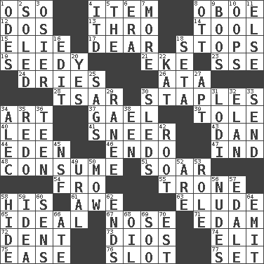ACROSS 1. Bear (Spanish) 4. A distinct part 8. Mitch Miller's instrument 12. Two (Sp.) 13. Through, poetically 14. Instrument 15. Writer Wiesel 17. Letter starter 18. Discontinues 19. Morally degraded 21. Make supply last 23. Compass dir. 24. Frees from moisture 26. _ moment's notice (2 wds.) 28. Russian ruler of old 30. Paper fasteners 34. Nonscientific branch of learning 37. Highlander 39. Lacquered or enameled metalware 40. Area sheltered from the wind 41. Contemptuous expression 43. One of the 12 tribes of Israel 44. Paradise 46. Inside; within (prefix) 47. Indiana (abbr.) 48. Ingest 51. Fly high 54. From 55. Marketplace scale 58. Part of HMS, perhaps 61. Deep reverence 63. Evade 65. Perfect 67. Olfactory organ 71. Dutch treat 72. Incision 73. "Vaya con ____" 74. Connecticut Ivy Leaguer 75. Comfort 76. Notch 77. Arrange properly for use DOWN 1. Lyric poems 2. Having a sole or soles 3. Flexible twig of a willow tree 4. It would 5. Definite Article 6. Epoch 7. Greater amount 8. Baseball player Mel 9. Expressions of contempt or scorn 10. I made a mistake 11. Otherwise 16. Prepare for publication 18. Bristle 20. It is so 22. Krazy ___ of comics 25. Droops 27. Fitting 29. Indian princess (variant) 30. Bobsleighs 31. Farming town in central California 32. Enthusiasm 33. Post 34. Actor Baldwin 35. Redecorate 36. Adolescent 38. Car or cant ending 42. Carrot, for example 45. Overdraft (abbr.) 49. Mountain range 50. Cut the grass 52. "We ___ not amused" (Victoria) 53. Hero or heavy, e.g. 56. Unclothed pictures 57. Peak District village in England 58. Flintstone garb 59. It may be bright or harebrained 60. Elected reps. 62. Conclusions 64. Send forth 66. Had dinner 68. Lubricate 69. "Barney Miller" actor Jack 70. Eastern Standard Time (abbr.)