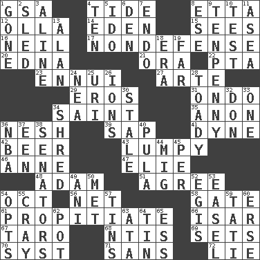 ACROSS 1. Girls' org. (abbr.) 4. Periodic rise and fall of the sea level 8. Singer James 12. Water jar 14. Genesis locale 15. Perceives with the eye 16. Famous astronaut Armstrong 17. Unrelated to defense, as in spending 20. Pulitzer Prize-winning author Ferber 21. Mouth or opening 22. Parent Teacher Assoc. 23. World-weariness 27. Johnson of "Laugh-In" 29. Greek god of love 31. Southwest Nigerian state 34. Virtuous person 35. At once, immediately (arch.) 36. Delicate 39. Plant excrement 41. Centimeter-gram-second unit of force 42. Fermented drink made from hops 43. Containing lumps 46. Queen of England 1702-14 47. Writer Wiesel 48. First of billions? 51. Match 54. Sep. follower 56. Fish or hair follower 58. Yard entry 61. Appease 66. Austrian river, tributary to the Danube 67. Pacific island yam 68. Nuclear Threat Initiatives 69. Arranges properly for use 70. System (abbr.) 71. Without 72. Falsehood DOWN 1. Went 2. Downhill vehicle 3. Place in a line 4. "___ Little Indians" 5. Wedding promise 6. Lair 7. Inside; within (prefix) 8. Compass dir. 9. 3-inch nail 10. Trial 11. Toward the sea 13. ____ Jay Lerner 18. Period 19. Distant 24. Teachers' org. 25. RI univ. 26. Charged atoms 28. Sycophant 30. Lacking originality or spontaneity 32. Spanish title 33. Single 34. Fragment 36. Basketball assoc. 37. Car or cant ending 38. Legislators 40. Monetary unit of Botswana 44. Russian fighter aircraft 45. For each 49. Black tropical American cuckoo 50. Was introduced to 52. The front part of a cuirass 53. Artist's stand 54. Chooses 55. Supercomputer manufacturer 57. Canisters 59. Jacques of French films 60. Celtic language 62. Plant holder 63. "One Day ___ Time" 64. Metal container 65. Curvy letter