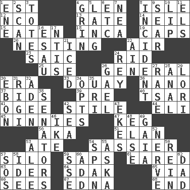 ACROSS 1. Eastern Standard Time (abbr.) 4. Small, secluded valley 8. Small island 12. Non-commissioned officer (abbr.) 13. Pace 14. Famous astronaut Armstrong 15. Eroded 18. South American Indian 19. Balmoral and tarboosh 20. Snuggling 22. Wind 23. Ketch in the Levant 24. To free from 25. Purpose 26. Commissioned military rank 30. Epoch 33. A city in N France, SE of Calais 36. Billionth: prefix 37. Auction offers 39. Before (prefix) 40. Russian ruler of old 41. Double curve, resembling the letter S 42. Vertical member of a panel or frame 44. Connecticut Ivy Leaguer 45. Fools 47. Barrel 50. Alias (abbr.) 51. Liveliness 53. Had dinner 54. More disrespectful 57. Grain storage tower 59. Plant excrements 61. Having ears or earlike features 63. River in Europe 64. Neighbor of Neb. 65. By way of 66. Perceives with the eye 67. Pulitzer Prize-winning author Ferber 68. Conclude DOWN 1. Compass dir. 2. Skim 3. Lugs 4. Amused look 5. Austrian-born American filmmaker Fritz 6. And so on (abbr.) 7. Teachers' org. 8. Event 9. Wither 10. Mouth edge 11. Raised railways 16. He sold his birthright 17. Nuclear Threat Initiatives 21. On the rocks 22. The 18th letter of the Arabic alphabet 24. Marina Del _, California 26. Highlander 27. Raze (variant) 28. Of or related to the anus 29. Australian parrot (variant) 30. Inky black, to poets 31. Swiss mountan, "Queen of the Mountains" 32. An important port of Yemen 34. Chooses 35. RI univ. 38. Legislators 42. Ocean 43. Supplements with great effort 46. Mamie's husband 48. Otherwise 49. Greek goddess of the earth (variant) 52. Boldness 53. Toward shelter 54. Connect, as a bridge 55. "____ silly question..." 56. It's straight from the horse's mouth 57. Distress signal 58. Binary compound 59. Compass dir. 60. Say or write further 62. June honoree