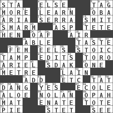 ACROSS 1. R.R. building 4. Otherwise 8. Label 11. Greater amount 13. Memorize 15. Chief or king in Benin or Nigeria 16. Operatic vocal solo 17. Spanish missionary in California 18. Stricken, poetically 19. Excessive but superficial compliments 21. Cleo's killer 22. Wig 23. Layer 24. Clumsy lout 27. Wind 29. Competent 30. Clothes sense 34. Opposite of masc. 36. Snakelike fish 39. Unemotional 40. Pack (down) 41. Proofreads 43. "Corrida" creature 44. Satellite of Uranus 46. Neighbor of Neb. 47. Single 48. Distance measurement (Brit.) 49. (Had) reclined 51. Find the sum of 53. And so on (abbr.) 54. Make lace 57. Mild oath, euphamism for damn 60. Affirmative reply 63. Learning spot: Fr. 65. Medicinal plant 66. Pitcher Ryan 69. Brightly colored fish 70. Floor covering 71. Related on the mother's side 72. Lug 73. Sliced dessert 74. Proofreading order 75. Perceive with the eye DOWN 1. Box-office sellout 2. Singer Mel 3. Believer in; advocate of (suffix) 4. Raised railways 5. Area sheltered from the wind 6. "Two Mules for Sister ____" 7. Blunders 8. Heavy book 9. "This won't hurt ____!" 10. Yard entry 12. Hearing organ 14. California wine valley 18. Ski resort town in Vermont 20. Crowd into 25. Toward shelter 26. Eats 28. ___ a Wonderful Life 29. Electrical Measurement 31. Within a short period 32. Hoop that covers a wheel 33. Environmental prefix 34. Conductor's collection 35. Give off 37. Hat (slang) 38. Showing deterioration from age 40. Scottish cap 42. Three-handed card game 45. Directed 50. Frozen water 52. Unit of force 54. Traditional theme or motif 55. Having winglike extensions 56. Giggle 57. Moist 58. Jai _ 59. Musical sound 61. Immeasurably long periods of time 62. Narrow board 64. Small bed 67. Had dinner 68. Fish or hair follower