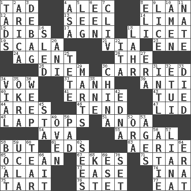 ACROSS 1. Small boy 4. Actor Baldwin 8. Flair 12. "We ___ not amused" (Victoria) 13. Stitch closed the eyes of (a falcon) 14. Pale green bean 15. Claim 17. Hindu god of fire 18. It is permitted: Lat. 19. Any of the three canals of the cochlea 21. By way of 23. Compass dir. 24. Representative 26. Definite Article 28. South Vietnam president (1954) 30. Borne 34. Promise 37. Hyperbolic tangent 39. Against 40. Mamie's husband 41. Bert's buddy 43. Third day of the wk. 44. Ancient Greek god of war 46. Look after 47. Flaplike covering 48. Portable computers 51. Small Philippine buffalo 54. Actress Gardner 55. Therefore, facetiously 58. Yet 61. Begley and Asner 63. Nest on high 65. Sea 67. Supplements with great effort 71. Play the lead 72. Mountain range southwest of Kyrgyzstan 73. Comfort 74. _ tizzy (2 wds.) 75. Small pie 76. Proofreading order 77. Erode DOWN 1. Bits 2. N. Chile seaport 3. Debunk (Brit. slang) 4. White ___ sheet 5. Part of a journey 6. Car or cant ending 7. 154 in Roman numerals 8. Biblical high priest 9. Louse (plural) 10. So be it 11. Nathan's nickname 16. Downhill vehicle 18. Cowardly lion portrayer 20. Black tropical American cuckoo 22. Call ___ day 25. Wig 27. Period 29. Shops 30. Large country 31. International (abbr.) 32. Needle case 33. Passed on 34. Small bottle 35. Gumbo ingredient 36. Shed a tear 38. Compass dir. 42. Pulitzer Prize-winning author Ferber 45. R.R. building 49. Baking chamber 50. Groovy apt. 52. Mouth or opening 53. Grows older 56. Nick name for Arthur 57. Climbing, woody, usually tropical vines 58. Water vessel 59. Southern CA. univ. 60. Pull apart 62. Perceives with the eye 64. Part of Q.E.F. 66. Small island 68. Krazy ___ of comics 69. Compass dir. 70. Put into a specified state