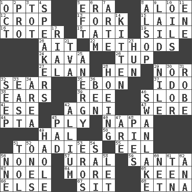 ACROSS 1. Elects 5. Epoch 8. _ vera 12. Riding implement 13. Tined utensil 15. (Had) reclined 16. Carrier 18. Jacques of French films 19. Filth; sediment 20. Small island 22. Modes 24. Polynesian shrub of the pepper family 26. Uncastrated adult male sheep 27. Enthusiasm 28. Layer 29. Not either 32. Wither 35. Inky black, to poets 37. Wedding promise 38. Hearing organs 39. To sift 40. Oscar Madison type 41. Compass dir. 42. Hindu god of fire 43. We are 44. Parent Teacher Assoc. 45. Travel a route regularly 46. California wine valley 49. Actor Linden 50. Broad smile 51. Sycophants 55. Snakelike fish 56. Words to Nanette 57. Mountain range 59. Before Barbara or Clara 63. Christmas carol 64. Greater amount 65. Peachy ____! 66. Otherwise 67. Be seated 68. Inactive volcano in Sicily DOWN 1. Sep. follower 2. Adept person 3. Small child 4. Orators 5. Bank Draft (abbr.) 6. Wander aimlessly 7. Johnson of "Laugh-In" 8. Columnist Joseph or Stewart 9. Put down 10. Lubricates 11. Compass dir. 14. Baby cat 17. Monetary unit of Yemen 21. Federal power corp. 23. Attila the _ 25. Disorder of the immune system 28. Weeding 29. Mediterranean tributary 30. Scent 31. Loose flowing garment 32. Ooze 33. 90 degrees 34. Type of rug 36. Benjamin's nick name 40. Tchaikovsky ballet 42. Plant genus of onion and garlic 45. Writing tablet 47. "We ___ not amused" (Victoria) 48. Sliced desserts 49. White Person, in Hawaii 51. Instrument 52. Singles 53. Greek god of love 54. Indian skirt 56. Compass dir. 58. Allow 60. Fish or hair follower 61. Nine, plus one 62. Santa ___, CA