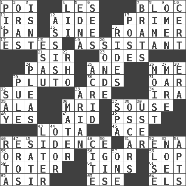 ACROSS 1. Luau course 4. French article 7. Coalition 11. Big collection agency 12. Helper 13. First class 14. Baking dish 15. Trig term 16. Wanderer 17. _____ Park, CO 19. Aide 21. Title for a knight 23. Lyric poems 24. Romantic infatuation 25. A saturated hydrocarbon 26. Madame (abbr.) 29. Greek god of the underworld 30. Music discs 31. Rowing implement 32. Institute legal proceedings 33. "We ___ not amused" (Victoria) 34. Lyricist Gershwin 35. Chicken ___ king 36. Medical imaging device (abbr.) 37. Lush 40. Consenting reply 41. Help 42. Inconspicuous attention getter 43. Globular water bottle used in Asia 45. Adept person 46. Home 51. Sports stadium 55. Speaker 56. Composer Stravinsky 58. Chop off 59. Carrier 60. Airtight sealed metal containers 61. Put into a specified state 62. SW Saudi Arabia district 63. Compass dir. 64. Raised railways DOWN 1. Corncob 2. Mouths or openings 3. Is not 4. Cards in a Roman deck? 5. Pulitzer Prize-winning author Ferber 6. Observes 7. Naughty children 8. Pale green bean 9. Presage 10. Foregone conclusion 12. Aid 13. Airs 16. Amusement-park features 18. He sold his birthright 20. Message 22. 17th letter of the Greek alphabet 24. Entreaties 25. Bitter 26. Damp 27. Female horse 28. Epoch 29. Whimper 32. Declare 33. Believer in; advocate of (suffix) 36. Mother 37. Health resort 38. Motion picture awards 39. One who uses or employs something 43. 61 cubic inches 44. Aroma 46. Roll call or roster of names 47. Greek god of love 48. Suttee (variant) 49. Quote 50. The front part of a cuirass 52. Otherwise 53. Christmas carol 54. Flats, for short 57. Single