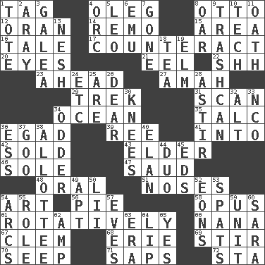 ACROSS 1. Label 4. Cassini of fashion 8. Von Bismarck 12. NW Algerian seaport 14. San ____ (Riviera town) 15. Length times width 16. Falsehood 17. Neutralize 20. Sight organs 21. Snakelike fish 22. Quiet! 23. At or in the front 27. Nanny 29. Long journey 31. Glance over 34. Sea 35. Baby powder 36. Mild oath 39. To separate or throw off 41. To the inside or interior of 42. Disposed of to a purchaser 43. A person who is older than you are 46. Flatfish 47. Saudi Arabian king (1953-1964) 48. Taken by mouth 51. Olfactory organs 54. Tate display 56. Sliced dessert 58. Musical composition 61. Producing rotation 66. Nanny 67. To starve (Brit.) 68. 4th largest of the Great Lakes 69. Commotion 70. Ooze 71. Plant excrements 72. R.R. building DOWN 1. Haul 2. Like ___ of sunshine 3. An organ shaped like a helmet 4. The grampus (Milton) 5. Lion 6. Australian flightless bird 7. Went 8. Rowing implement 9. File 13 10. Georgia ____ (Atlanta school) 11. Pledge 13. Soft 18. Afternoon social gathering 19. Shade tree 24. And so on (abbr.) 25. "We ___ not amused" (Victoria) 26. Letter starter 28. Being in motion 30. Leg joints 32. Keyboard modifier key 33. Non-commissioned officer (abbr.) 34. More peculiar 36. Curvy letter 37. Thick or sticky substance 38. One to whom something is allotted 40. Enthusiasm 44. Superhero pair 45. Begley and Asner 49. Fitting 50. Cards in a Roman deck? 52. Immeasurably long periods of time 53. Arguments over trivial matters 54. Arches 55. Hero or heavy, e.g. 57. Nights before holidays 59. A single undivided whole 60. "Two Mules for Sister ____" 62. Electrical Unit 63. Epoch 64. Mouth edge 65. Affirmative reply