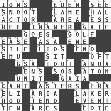 ACROSS 1. Charged particles 5. Paradise 9. Perceive with the eye 12. Snob 14. Unable to walk 15. Actor Linden 16. Thespian 17. Length times width 18. Curvy letter 19. To riddle 20. Sillier 23. Yard entry 24. Moves 25. _ course 27. Comfort 30. White ___ sheet 32. Compass dir. 33. Drop; flow; fall 34. Hats (slang) 36. Conclude 38. Australian flightless bird 39. Be seated 40. Often (poetically) 43. Girls' org. (abbr.) 46. A blast of a horn 48. Small Philippine buffalo 49. Followers of ems 51. Distress signal 52. Smallest unit of an element 53. A single undivided whole 54. Greek goddess of the earth (variant) 56. Patter 58. Michaelmas daisies 61. Period 64. Biblical high priest 65. Roberta Peters solo 66. Member of a famous L.A. basketball team 68. Friend of Pooh 69. Look after 70. Happening 71. Nine, plus one 72. Ancient Greek god of war 73. Singer Brickell DOWN 1. Austrian river, tributary to the Danube 2. Single time 3. Make mention of 4. "Barney Miller" actor Jack 5. Enthusiasm 6. Have the gumption 7. Develop 8. Teachers' org. 9. Archer's quiver 10. 90 degrees 11. Otherwise 13. Musical group of three 21. Be tempered by heat 22. Aid 23. Small, secluded valley 24. Turn to the right 26. Single 27. Compass dir. 28. Direct toward a target or goal 29. Snaillike creature with no shell 31. Goodbye (Sp.) 35. Moe Howard, for one 37. Do not 41. Egg _ yung 42. Scottish cap 44. Transmitted 45. Black tropical American cuckoo 47. Russian ruler of old 48. American Automobile Association (abbr.) 50. A viewer who gazes fixedly 53. The state of being joined or united 55. Capri or Wight 56. Foregone conclusion 57. Medicinal plant 59. Trig term 60. Small boys 61. Supplemented with great effort 62. Painter Guido (1575-1642) 63. Johnson of "Laugh-In" 65. "One Day ___ Time" 67. "___ Maria"