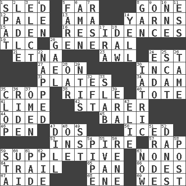 ACROSS 1. Downhill vehicle 5. Distant 8. Went 12. Diluted with white 13. Housemaid (var.) 14. Tall tales 15. An important port of Yemen 16. Homes 19. Affectionate concern, for short 20. Commissioned military rank 21. Inactive volcano in Sicily 23. Leather borer 24. Eastern Standard Time (abbr.) 27. A really long time 30. South American Indian 31. Food holders 34. First of billions? 35. Riding implement 38. Ransack; plunder; pillage 40. Haul 41. Welles in "The Third Man" 42. A viewer who gazes fixedly 44. Wrote a lyric poem 45. Indonesian resort city 46. Fenced enclosure 47. Two (Sp.) 50. On the rocks 53. Heighten or intensify 57. Reproach for some lapse or misdeed 59. Supplying deficiencies 63. Words to Nanette 64. Lag or linger behind 65. Baking dish 66. Lyric poems 67. Assistant 68. Compass dir. 69. 270 degrees DOWN 1. Argument over a trivial matter 2. Dipping utensil 3. Opt 4. Lair 5. Conductor's collection 6. So be it 7. Raze (variant) 8. Separate the seeds from cotton 9. The grampus (Milton) 10. Compass dir. 11. Double-curved letter 14. Shout 17. Retirement account (abbr.) 18. Simpleton 20. Highlander 22. Slept 24. Inside; within (prefix) 25. Get outta here! 26. Docile 28. Boat paddle 29. Nuclear Threat Initiatives 30. Of or pertaining to medicine 32. Newt 33. Thick slice 35. Hoof sound 36. Travel on an animal 37. Sign of something about to happen 39. Period 43. Writer Wiesel 47. Deli pickle 48. Single 49. Fast jet (abbr.) 51. Wear away 52. Natives or inhabitants of Denmark 54. Corncob 55. "Terrible" tsar 56. French philosopher Descartes 58. Mail 59. R.R. building 60. RI univ. 61. Groovy apt. 62. Sliced dessert 63. Immediately