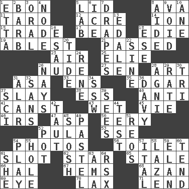 ACROSS 1. Inky black, to poets 5. Hat (slang) 8. Actress Gardner 11. Edible starchy tuberous root 12. 43,560 square feet 14. Electrically charged atom 15. Barter 17. Necklace unit 18. Singer Brickell 19. Most capable 21. Went by 23. Wind 25. Writer Wiesel 26. Naked 27. Elected rep. 28. Tate display 31. White ___ sheet 33. Followers of ems 35. _ Allan Poe 37. Kill 38. Double-curved letter 40. Opposed to 41. 2nd pers. sing. pres. of can (arch.) 43. Dripping 45. Compete 46. Big collection agency 47. Viper 50. Suggestive of the supernatural 52. Monetary unit of Botswana 53. Compass dir. 54. Pictures 56. Rest room 61. Narrow opening 62. Play the lead 65. Showing deterioration from age 66. Actor Linden 67. Folds over and sews together 68. Muslim summons to prayer 69. Sight organ 70. Not strict 71. Grant temporary use of DOWN 1. Singer James 2. Sharp remark 3. Spoken 4. Thickened enlargement 5. Experiment locale 6. Frozen water 7. Window treatments 8. Helper 9. Lacking any legal or binding force 10. One (Scot) 13. Peak District village in England 16. Son of Isaac 18. Compass dir. 20. Event that recurs at intervals 22. Trig term 24. French philosopher Descartes 26. Negative votes 28. Hindu god of fire 29. Pace 30. Three (prefix) 31. Having or resembling wings 32. Without 34. Compass dir. 36. American folk hero Crockett 37. _-fi 39. Observes 42. Drawn tight 44. Trial 48. Make a splashing sound 49. Soft color 51. Vintage cars 52. Cooking vessel 54. Romp 55. Hollow 57. Slanted text style (abbr.) 58. Goldbrick 59. Liveliness 60. Watch over 61. A female animal or person 63. Nanny (var.) 64. Acura sports coupe