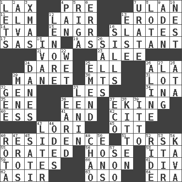 ACROSS 1. Not strict 4. Before (prefix) 7. ____ Bator, Mongolia 11. Shade tree 12. Den 13. Eat (away) 14. Federal power corp. 15. Engineer (abbr.) 16. Chalkboards 17. Indian antelope 19. Aide 21. Solemn pledge 23. Toward shelter 24. Have the gumption 25. Pipe bend 26. Chicken ___ king 29. French painter Edouard 30. Mountains (abbr.) 31. Car dealer's back yard 32. Commissioned mil. rank 33. French article 34. _ tizzy (2 wds.) 35. Compass dir. 36. Car or cant ending 37. Supplementing with great effort 40. Double-curved letter 41. Also 42. Quote 43. Australian parrot (variant) 45. Baseball player Mel 46. Dwelling 51. Cod relative 55. Declaimed 56. Stockings 58. Call ___ day 59. Hauls 60. At once, immediately (arch.) 61. HTML Container Element 62. SW Saudi Arabia district 63. Bear (Spanish) 64. Epoch DOWN 1. Allows 2. Inventor's middle name 3. Dec. holiday 4. Baking dish 5. Capital of Latvia 6. Blunders 7. A salt of uric acid 8. Globular water bottle used in Asia 9. An important port of Yemen 10. Egg locale 12. Poe poem 13. Otherwise 16. Beverly of Met fame 18. _ the terrible 20. Table seasonings 22. Dripping 24. Natives or inhabitants of Denmark 25. Make improvements or corrections to 26. Place in a line 27. Having great length 28. _ moment's notice (2 wds.) 29. Not women's 32. Turn to the right 33. Soviet premier 1918-24 36. Having ears or earlike features 37. Environmental prefix 38. Baby cat 39. "Tell ____ the Marines!" 43. 61 cubic inches 44. Lyric poems 46. Round or rotation of duties 47. Greek god of love 48. Suttee (variant) 49. US Secretary of Labor Elaine L. _ 50. Immeasurably long periods of time 52. Travel on or in a vehicle 53. Use a swizzle stick 54. Polynesian shrub of the pepper family 57. "Barney Miller" actor Jack