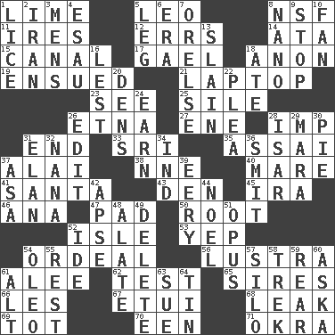 ACROSS 1. Welles in "The Third Man" 5. Lion 8. Science/research agcy. 11. Angers 12. Blunders 14. "One Day ___ Time" 15. Lessep's creation 17. Highlander 18. At once, immediately (arch.) 19. Took place subsequently 21. Portable computer 23. Perceive with the eye 25. Drop; flow; fall 26. Inactive volcano in Sicily 27. Compass dir. 28. Mischievous child 31. Conclusion 33. _ Lanka 35. Slender Brazilian palm 37. Mountain range southwest of Kyrgyzstan 38. Compass dir. 40. Female horse 41. Before Barbara or Clara 43. Lair 45. Retirement account (abbr.) 46. Santa ___, CA 47. Groovy apt. 50. Carrot, for example 52. Capri or Wight 53. Slangy assent 54. Severe or trying experience 56. A period of five years 61. Toward shelter 62. Trial 65. Begets 66. French article 67. Needle holder 68. Path through which fluid escapes 69. Small child 70. Car or cant ending 71. Gumbo ingredient DOWN 1. Louse (plural) 2. SW Asia republic 3. Not women's 4. He sold his birthright 5. Part of a journey 6. Epoch 7. Threatening words 8. Billionth: prefix 9. Halt 10. Air blower 13. Killed 16. For fear that 18. Had dinner 20. Lairs 22. Entreaty 24. Merit 26. Prepare for publication 28. Austrian river, tributary to the Danube 29. Hindu Mythology: god of death 30. Sliced dessert 31. Style 32. Nanny 34. Indiana (abbr.) 36. Stricken, poetically 37. White ___ sheet 39. Suggestive of the supernatural 42. Domed church section 44. Christmas carol 48. Having winglike extensions 49. Erase 51. Musical composition 52. Binary compound 54. Butter sub 55. State of inaction 57. Grain storage tower 58. Long journey 59. Buttocks 60. "____ silly question..." 61. The first octave above the treble staff 63. Institute legal proceedings 64. Shallow baking pan