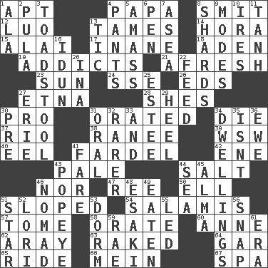 ACROSS 1. Fitting 4. Dad 8. Stricken, poetically 12. Nilotic language 13. Corrects by punishment or discipline 14. Israeli folk dance 15. Mountain range southwest of Kyrgyzstan 17. Empty; void 18. An important port of Yemen 19. Inveterate users 21. Anew 23. Player for Phoenix 24. Compass dir. 26. Begley and Asner 27. Inactive volcano in Sicily 28. "______ My Girl" (Turtles hit) 30. Adept person 31. Declaimed 34. Pass on 37. _ de Janeiro 38. The wife of a rajah (variant) 39. Compass dir. 40. Snakelike fish 41. Pack 42. Compass dir. 43. Light colored 44. Table seasoning 46. Not either 47. To separate or throw off 50. Pipe bend 51. Inclined 54. Deli grouping 57. Heavy book 58. Declaim 60. Singer Murray 62. Like ___ of sunshine 63. Swept the length of 64. Slender fish 65. Travel on an animal 66. Count _ (2 wds.) 67. Health resort DOWN 1. Chicken ___ king 2. Monetary unit of Botswana 3. Inedible or poisonous agaric 4. Leg coverings 5. Collect or gather 6. Writing instrument 7. At sea 8. Broken pieces 9. Methods 10. Angers 11. Hyperbolic tangent 13. Nervous spasm 16. Goddess of spring and wife of Bragi 20. _ tizzy (2 wds.) 22. Nourish 25. First name in cosmetics 27. 4th largest of the Great Lakes 29. The bottom of a shoe or boot 30. Before (prefix) 31. Of the mouth 32. Less widely known 33. Added to 34. Homes 35. Is not 36. She-sheep 41. Conductor's collection 43. Wimpy's pal 44. Ocean 45. _ mater 46. Wanderer 48. 1973 Nobel Price Winner (Physics) Leo 49. Ingested 51. Play the lead 52. Australian parrot (variant) 53. Dormintory (informal) 55. Directed 56. Fastener 59. Actress Charlotte 61. Epoch