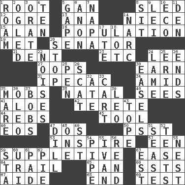 ACROSS 1. Carrot, for example 5. Separate the seeds from cotton 8. Downhill vehicle 12. Legendary monster 13. Santa ___, CA 14. Sibling's daughter 15. Actor Alda or Thicke 16. Census information 19. Was introduced to 20. Legislator 21. Gouge 23. And so on (abbr.) 24. Area sheltered from the wind 27. I made a mistake 30. Merit 31. Medicinal drug used to evoke vomiting 34. Among 35. Crowds into 38. Relating to or accompanying birth 40. Perceives with the eye 41. _ vera 42. Cylindrical with tapered ends 44. Confederate soldiers (slang) 45. Utensil 46. Greek goddess of the dawn 47. Two (Sp.) 50. Inconspicuous attention getter 53. Motivate 57. Car or cant ending 59. Supplementary 63. Comfort 64. Lag or linger behind 65. Baking dish 66. Fast planes 67. Assistant 68. Conclude 69. Trial DOWN 1. Wander 2. Stared 3. Speak pompously 4. "___ Little Indians" 5. Yawn 6. Soon (poet.) 7. California wine valley 8. Be seated 9. Flowery wreath 10. Environmental prefix 11. Lair 14. Drug cop 17. Shoshoni 18. Car dealer's back yard 20. Discontinue 22. Annoying sounds 24. Unable to walk 25. 4th largest of the Great Lakes 26. Conclusions 28. Animal enclosure 29. Jazz singing style 30. Artist's stands 32. Had dinner 33. Haul 35. Female horse 36. Margarine 37. Moves up and down 39. Lion 43. Drink excessively 47. Deli pickle 48. Single 49. Fast jet (abbr.) 51. Gospel singer Marvin 52. Trials 54. Corncob 55. "Terrible" tsar 56. Tear apart 58. Egg locale 59. R.R. building 60. RI univ. 61. Writing tablet 62. Sliced dessert 63. Eastern Standard Time (abbr.)