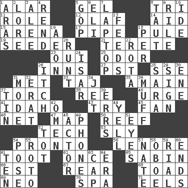 ACROSS 1. Having or resembling wings 5. Set 8. Three (prefix) 11. Hero or heavy, e.g. 12. Norwegian king 14. Help 15. Sports stadium 17. Corncob 18. Whine 19. Sowing specialist 21. Cylindrical with tapered ends 23. Fr. "Yes" 25. Scent 26. Taverns 27. Pacific Standard Time (abbr.) 28. Compass dir. 31. Was introduced to 33. _ Mahal 35. With great haste 37. Torque (variant) 38. To sift 40. Goad 41. Potato state 43. Attempt 45. Avid follower 46. Fish or hair follower 47. Atlas unit 50. Coral collection 52. Technician 53. Insidious 54. Right away 56. Poe poem 61. A blast of a horn 62. At one time in the past 65. Unit of acoustic absorption 66. Eastern Standard Time (abbr.) 67. Rump 68. Frog relative 69. Modern: prefix 70. Health resort 71. Snakelike fish DOWN 1. Ancient river in northeast Turkey 2. Old wives' tales, e.g. 3. Toward shelter 4. Tear apart 5. Grand Old Party 6. Biblical high priest 7. Portable computer 8. Pulled tight 9. Cause heat under the collar 10. Binary compound 13. Gives food to 16. Age 18. For each 20. Undersized animal 22. Roll call or roster of names 24. Austrian river, tributary to the Danube 26. Hankering 28. "Two Mules for Sister ____" 29. Public display of a written message 30. Compass dir. 31. Method 32. Part of Q.E.F. 34. Passenger plane 36. Bungle 37. Shallow baking pan 39. Blunders 42. Presage 44. Shout 48. Thespian 49. Gives a jingle 51. Snake ____ (dice throw) 52. Small child 54. Introduce or present, as a question 55. Printing process, for short 57. Nathan's nickname 58. Mitch Miller's instrument 59. Monetary unit of Yemen 60. Extremities 61. "___ Little Indians" 63. Head covering 64. Epoch
