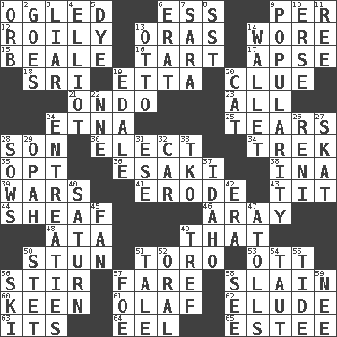 ACROSS 1. Stared 6. Double-curved letter 9. For each 12. Agitated, as a liquid 13. Mouths or openings 14. Had on 15. Memphis, Tenn. Street 16. Small pie 17. Domed church section 18. Indian title of respect (Mr.) 19. Singer James 20. A slight indication 21. Southwest Nigerian state 23. Everything 24. Inactive volcano in Sicily 25. Rends 28. Manchild 30. Choose 34. Long journey 35. Choose 36. 1973 Nobel Price Winner (Physics) Leo 38. _ tizzy (2 wds.) 39. Armed conflicts 41. Eat (away) 43. Teat (slang) 44. To gather and bind into a bundle 46. Like ___ of sunshine 48. "One Day ___ Time" 49. Not this but _ 50. Make senseless or dizzy 51. "Corrida" creature 53. Baseball player Mel 56. Move through with a circular motion 57. Conductor's collection 58. Killed 60. Peachy ____! 61. Norwegian king 62. Dodge 63. It is 64. Snakelike fish 65. First name in cosmetics DOWN 1. Globe 2. Travels 3. One who doesn't tell the truth 4. American author Paul (1891-1958) 5. Color 6. Part of Q.E.F. 7. "Two Mules for Sister ____" 8. Fast jet (abbr.) 9. Teen's desire 10. Celtic language 11. Portuguese money of account (variant) 13. "Beetle Bailey" pooch 14. Place for singles 19. Peak District village in England 20. Domesticated feline 22. Compass dir. 24. Pleas 26. Painter Guido (1575-1642) 27. Three-handed card game 28. Sty mamas 29. Brightly colored fish 31. Compass dir. 32. Auto 33. Ring climax 37. Potato state 40. Titan orbits this 42. Epoch 45. Avid follower 47. Ringlike coral islands and reefs 49. Not kosher 50. Proofreading order 51. Story 52. Of the mouth 54. Pulled tight 55. Event that recurs at intervals 56. What Jean-Claude Killy likes to do 57. Enemy 58. Observe 59. Born
