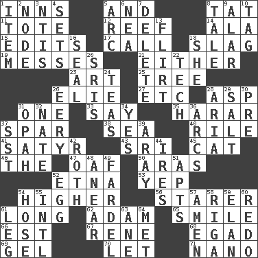 ACROSS 1. Taverns 5. Added to 8. Make lace 11. Haul 12. Coral ridge 14. In the manner of 15. Proofreads 17. Give a ring to 18. Volcanic refuse 19. Makes clutter 21. One or the other of two 23. Tate display 25. Woody plant 26. Writer Wiesel 27. And so on (abbr.) 28. Cleo's killer 31. Single 33. Declare 35. Ethiopian city, capital of Harari 37. Coast Guard woman 38. Ocean 40. Cause heat under the collar 41. Man with strong sexual desires 43. Indian title of respect (Mr.) 45. Domesticated feline 46. Definite Article 47. Clumsy lout 50. Ancient river in northeast Turkey 52. Inactive volcano in Sicily 53. Slangy assent 54. Having greater elevation 56. A viewer who gazes fixedly 61. Yearn 62. First of billions? 65. Grin 66. Eastern Standard Time (abbr.) 67. French philosopher Descartes 68. Mild oath 69. Set 70. Allow 71. Billionth: prefix DOWN 1. Detail 2. Connecting point 3. Nuclear Threat Initiatives 4. Puts into a specified state 5. Curve 6. Teachers' org. 7. Erase 8. Lie 9. Having or resembling wings 10. Label 13. Seductive woman who exploits men 16. Lick closed 18. A female animal or person 20. Indian titles of respect 22. Technology 24. Afternoon social gatherings 26. Suggestive of the supernatural 28. Roberta Peters solo 29. Table seasoning 30. Before (prefix) 31. Brightly colored fish 32. Nathan's nickname 34. Consenting reply 36. Curves 37. Fast jet (abbr.) 39. Like ___ of sunshine 42. Writer of Portnoy's Complaint (1969) 44. Angers 48. Approach 49. Pack 51. Flats, for short 52. Oval reproductive body of a fowl 54. Stockings 55. International (abbr.) 57. So be it 58. Port city in Latvia 59. Enthusiasm 60. Do over again 61. Part of a journey 63. One (Scot) 64. Was introduced to
