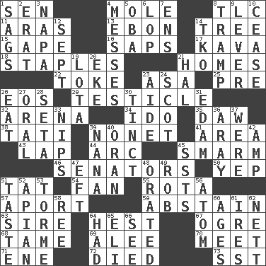 ACROSS 1. Elected rep. 4. Undercover agent 8. Affectionate concern, for short 11. Caspian sea tributary 13. Inky black, to poets 14. Family _ (genealogy) 15. Open wide 16. Plant excrements 17. Polynesian shrub of the pepper family 18. Paper fasteners 21. Dwellings 22. Casino tip 23. White ___ sheet 25. Before (prefix) 26. Greek goddess of the dawn 29. One of the two male reproductive glands 32. Sports stadium 34. Wedding promise 35. Simpleton 38. Jacques of French films 39. Music written for nine 41. Length times width 43. Infant locale 44. Curve 45. Excessive but superficial compliments 46. Legislators 50. Slangy assent 51. Make lace 54. Avid follower 55. Roll call or roster of names 57. To the left, to Queeg 59. Refrain by choice 63. The founder of a family 64. Behest 67. Legendary monster 68. Not wild 69. Toward shelter 70. Rendezvous 71. Compass dir. 72. Passed on 73. Fast jet (abbr.) DOWN 1. Droops 2. Part of Q.E.F. 3. California wine valley 4. Makes clutter 5. Chief or king in Benin or Nigeria 6. Trim (branches) 7. Followers of ems 8. _____ steamer (cargo ship) 9. Crowbar 10. Stop 12. Back-to-school mo. 14. Ring climax 19. Globular water bottle used in Asia 20. Supplement with great effort 21. Actor Linden 23. Assistant 24. Highlander 26. Erode 27. Of the mouth 28. Stalk of a moss capsule 30. Colored lightly or faintly 31. Dutch treat 33. Cuts off 36. Like ___ of sunshine 37. We are 39. Nanny 40. Northwest Algerian city 42. Electrical Unit 45. Fast planes 47. Lizard (obsolete) 48. Spoke pompously 49. Director Reiner 51. Clothes sense 52. Bee-related 53. Singer Mel 56. Tiny particle 58. To separate or throw off 60. Ripens 61. Angers 62. Remaining after all deductions 64. Possessed 65. Biblical high priest 66. Perceive with the eye