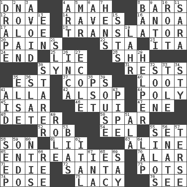 ACROSS 1. Heredity factor (abbr.) 4. Nursemaid 8. Drinking establishments 12. Be footloose 14. All-night dance parties 16. Small Philippine buffalo 17. Medicinal plant 18. Interpreter 20. Aches 22. R.R. building 23. Call ___ day 24. Conclusion 25. Falsehood 28. Quiet! 30. Synchronize (abbr.) 31. Musical pauses 35. Eastern Standard Time (abbr.) 37. 911 reaches them 40. Spoils 41. Silent film actress Nazimova 42. Columnist Joseph or Stewart 44. More than one (prefix) 45. Austrian river, tributary to the Danube 46. Needle case 47. Compass dir. 48. Prevent from occurring 50. Coast Guard woman 52. Director Reiner 54. Snakelike fish 55. Put into a specified state 58. Male child 61. Cards in a Roman deck? 63. Place in a line 65. Pleas 70. Having or resembling wings 71. Singer Brickell 72. Before Barbara or Clara 73. Cooking vessels 74. Introduce or present, as a question 75. Made of lace 76. Perceive with the eye DOWN 1. Window treatment 2. Pitcher Ryan 3. Prevent the occurrence of 4. Nonscientific branch of learning 5. Make imperfect 6. Actress Gardner 7. Coop moms 8. Sound made by sheep 9. Opposed to 10. Carrot, for example 11. "Two Mules for Sister ____" 13. Car or cant ending 15. Fast planes 19. Cowardly lion portrayer 21. Playfully artful 26. South American Indian 27. Learning spot: Fr. 29. Assistant 30. A viewer who gazes fixedly 32. Within a short period 33. Lacquered or enameled metalware 34. Filthy place 35. Otherwise 36. Narrow board 38. Pacific Standard Time (abbr.) 39. Boozer 41. Help 43. Corncob 49. Hero or heavy, e.g. 51. According to 53. Prejudice 55. Grain storage towers 56. Maternal 57. Laconic 58. Ooze 59. Southwest Nigerian state 60. Nuclear Threat Initiatives 62. Slanted text style (abbr.) 64. Pet locale 66. To separate or throw off 67. _ tizzy (2 wds.) 68. And so on (abbr.) 69. Declare