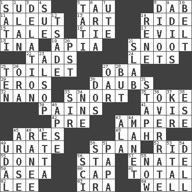 ACROSS 1. Soap bubbles 5. The 19th letter of the Greek alphabet 8. Pat or tap gently 11. Eskimo relative 13. Nonscientific branch of learning 14. Travel on an animal 15. Falsehoods 16. Make a knot 17. Morally bad or wrong 18. _ tizzy (2 wds.) 19. Capital of Western Samoa 21. Snout, nose 22. Bits 24. Allows 25. Rest room 27. Chief or king in Benin or Nigeria 29. Greek god of love 30. Applies to a surface 32. Billionth: prefix 33. Derisive sound 35. Puff or smoke 39. Aches 41. Opinion 42. Before (prefix) 43. Electrical Unit 45. Ancient Greek god of war 48. Cowardly lion portrayer 49. A salt of uric acid 50. Connect, as a bridge 52. To free from 55. Do not 56. R.R. building 57. Related on the mother's side 59. Toward the sea 60. Head covering 61. Add up to 62. Area sheltered from the wind 63. Retirement account (abbr.) 64. Water source DOWN 1. Suttee (variant) 2. ____ Bator 3. Accusation by an informer 4. Institute legal proceedings 5. Jacques of French films 6. Roberta Peters solo 7. Shoshoni 8. A piece of turf (Scot.) 9. Goodbye (Sp.) 10. Waist strap 12. Sadhe (variant) 14. French philosopher Descartes 20. Pacific Standard Time (abbr.) 21. Broad, flat, thick piece 23. Columnist Joseph or Stewart 25. Nine, plus one 26. Mouth or opening 27. Boat paddle 28. With the exception that 30. Two (Sp.) 31. Staphylococcus 33. Title for a knight 34. Compass dir. 36. Make much ado about nothing 37. Apertif with cassis 38. Compass dir. 40. Domed church section 43. Chicken ___ king 44. French painter Edouard 45. Came up 46. The wife of a rajah (variant) 47. Singer James 49. Allodial 50. Play the lead 51. Dad 53. Slanted text style (abbr.) 54. Small valley 56. _-fi 58. At this time