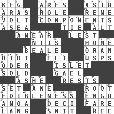 ACROSS 1. Barrel 4. Ancient Greek god of war 8. SW Saudi Arabia district 12. Ancient river in northeast Turkey 14. Hero or heavy, e.g. 15. French philosopher Descartes 16. Electrical Unit 17. Parts 20. At sea 21. Standoff 22. Keyboard modifier key 23. Approach 27. For fear that 29. Nuclear Threat Initiatives 31. Residence 34. Calif. Air Force Base 35. Northwest Algerian city 36. "You Light Up My Life" star Conn 39. Biblical high priest 41. United States Postal Service (abbr.) 42. Baltic tributary 43. Small island 46. Disposed of to a purchaser 47. Highlander 48. American tennis player Robert 51. Musical pauses 54. Arrange properly for use 56. Deep reverence 58. Carrot, for example 61. The property of being fit to eat 66. Engineer (abbr.) 67. Small Philippine buffalo 68. Tenth: prefix 69. Conductor's collection 70. Austrian-born American filmmaker Fritz 71. In a ____ (agitated or irritated) 72. Portuguese money of account (variant) DOWN 1. Polynesian shrub of the pepper family 2. Greek god of love 3. An organ shaped like a helmet 4. Curve 5. Friend of Pooh 6. Shade tree 7. Back-to-school mo. 8. "We ___ not amused" (Victoria) 9. Legislators 10. International (abbr.) 11. State of inaction 13. Comedian Laurel of Laurel & Hardy 18. Petroleum 19. Born 24. Compass dir. 25. _ moment's notice (2 wds.) 26. Cause heat under the collar 28. Yell 30. Major League Baseball Commissioner Bud 32. Atlas unit 33. Followers of ems 34. Avian creatures 36. Two (Sp.) 37. Wedding promise 38. Accusation by an informer 40. Austrian river, tributary to the Danube 44. Area sheltered from the wind 45. Raised railways 49. Actor Linden 50. She-sheep 52. Not kosher 53. Underwater navigation system 54. Lick closed 55. Pulitzer Prize-winning author Ferber 57. Conclusions 59. Legendary monster 60. Woody plant 62. Paper or plastic container 63. Car or cant ending 64. _-fi 65. Be seated