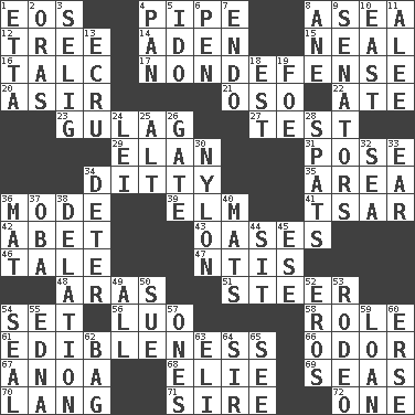 ACROSS 1. Greek goddess of the dawn 4. Corncob 8. Toward the sea 12. Family _ (genealogy) 14. Arabian gulf 15. Anneal 16. Baby powder 17. Unrelated to defense, as in spending 20. SW Saudi Arabia district 21. Bear (Spanish) 22. Had dinner 23. Russian prison camp 27. Trial 29. Enthusiasm 31. Airs 34. Simple song 35. Length times width 36. Method 39. Shade tree 41. Russian ruler of old 42. Collude with 43. Fertile tracts in a desert 46. Lie 47. Nuclear Threat Initiatives 48. Ancient river in northeast Turkey 51. Bull 54. Put into a specified state 56. Nilotic language 58. Hero or heavy, e.g. 61. The property of being fit to eat 66. Scent 67. Small Philippine buffalo 68. Writer Wiesel 69. Oceans 70. Long (Scottish) 71. Beget 72. Single DOWN 1. Singer James 2. Mouths or openings 3. Major League Baseball Commissioner Bud 4. Baking dish 5. Wedding promise 6. Writing instrument 7. Inside; within (prefix) 8. One (Scot) 9. Legislators 10. Compass direction 11. Toward shelter 13. Shade of tan 18. Eastern Standard Time (abbr.) 19. Enemy 24. Luau accessory 25. The first octave above the treble staff 26. Yard entry 28. Arguments over trivial matters 30. Thermoplastic polyamide 32. Ocean 33. Hearing organ 34. Prevent from occurring 36. Floor protector 37. Chief or king in Benin or Nigeria 38. Accusation by an informer 40. Floor coverings 44. Be seated 45. Compass dir. 49. Everything 50. Take to court 52. Greek god of love 53. Cowboy competition 54. Lick closed 55. Pulitzer Prize-winning author Ferber 57. Singles 59. Grant temporary use of 60. Celtic language 62. Paper or plastic container 63. Biblical high priest 64. Title for a knight 65. Observe