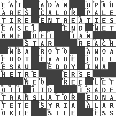 ACROSS 1. Consume 4. First man 8. Brightly colored fish 12. Ancient Greek god of war 14. Bodily heat indicating an inflammation 16. Diluted with white 17. Become fatigued 18. Pleas 20. Artist's stand 22. Conclusion 23. Fish or hair follower 24. Compass dir. 25. Often (poetically) 28. Scottish cap 30. Play the lead 31. Arrive at 35. Basketball assoc. 37. Printing process, for short 40. Small Philippine buffalo 41. Lowest support of a structure 42. Dodge 44. Hang loosely or laxly 45. Son of Isaac 46. Whirlpool 47. _ tizzy (2 wds.) 48. Distance measurement (Brit.) 50. Celtic language 52. Modern: prefix 54. To sift 55. Allow 58. Baseball player Mel 61. Hat (slang) 63. Sadhe (variant) 65. Interpreter 70. Pulitzer Prize-winning author Ferber 71. False hair 72. Damascus' land 73. Having or resembling wings 74. Migrant worker of the '30s 75. Filth; sediment 76. Curvy letter DOWN 1. Eroded 2. Believer in; advocate of (suffix) 3. Laconic 4. Adept person 5. Daniel's nick name 6. The first octave above the treble staff 7. Greater amount 8. Elect 9. Ache 10. Toward shelter 11. Command 13. Perceive with the eye 15. Monthly bill 19. The sixth month of the Jewish calendar 21. Car dealer's back yard 26. Conductor's collection 27. Collection of objects 29. Ear of corn 30. Titan orbits this 32. Soon (poet.) 33. Root beer relative 34. Actor Linden 35. Characteristic smell of wine 36. Water vessel 38. Bit 39. More peculiar 41. Opposite of masc. 43. Jane of fiction 49. Snakelike fish 51. Put into a specified state 53. Petroleums 55. Dipping utensil 56. Ferber et al. 57. Lacerates 58. Von Bismarck 59. Long journey 60. Jacques of French films 62. 24-hour periods 64. Ocean 66. Born 67. Three (prefix) 68. Lubricate 69. Actress Charlotte