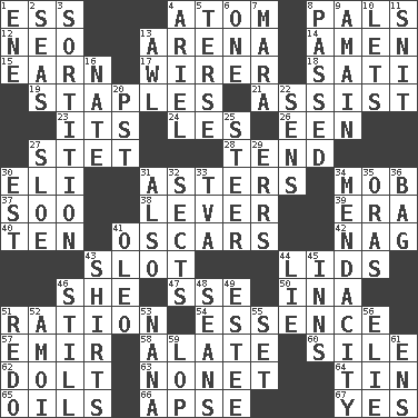 ACROSS 1. Curvy letter 4. Tiny particle 8. Friends 12. Modern: prefix 13. Sports stadium 14. So be it 15. Merit 17. One who wires 18. Suttee (variant) 19. Paper fasteners 21. Help 23. It is 24. French article 26. Car or cant ending 27. Proofreading order 28. Watch over 30. Connecticut Ivy Leaguer 31. Michaelmas daisies 34. Crowd into 37. "Barney Miller" actor Jack 38. Prying instrument 39. Period 40. "___ Little Indians" 41. Motion picture awards 42. Tired old horse 43. Slit 44. Flaplike coverings 46. A female animal or person 47. Compass dir. 50. _ tizzy (2 wds.) 51. Food allowance for one day 54. Core 57. Independent ruler or chieftain 58. Having winglike extensions 60. Drop; flow; fall 62. Dunce 63. Music written for nine 64. Metal container 65. Petroleums 66. Domed church section 67. It is so DOWN 1. Compass dir. 2. Oceans 3. Decision 4. Satellite of Uranus 5. Laconic 6. Single 7. Hindu Mythology: god of death 8. Went by 9. With great haste 10. Allows 11. In a ____ (agitated or irritated) 13. Leather borer 16. Nathan's nickname 20. Pacific Standard Time (abbr.) 22. Elected reps. 25. Navigate 27. A type of plum 29. Blunders 30. Eastern Standard Time (abbr.) 31. In addition 32. Religious groups 33. Federal power corp. 34. Ananias' fault 35. Mouths or openings 36. Paper or plastic container 41. Butter sub 43. Upper-body garments 44. Falsehood 45. Lodging establishments 46. Not moving 48. Actors Connery and Penn 49. First name in cosmetics 51. Make new 52. Mine, in Marseilles 53. Grandmother 55. Put into a specified state 56. Writer Wiesel 59. Trim (branches) 61. Followers of ems