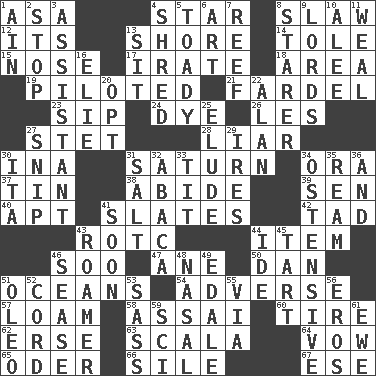 ACROSS 1. White ___ sheet 4. Play the lead 8. Cole _ (cabbage dish) 12. It is 13. Dinah or Pauly 14. Lacquered or enameled metalware 15. Olfactory organ 17. Feeling or showing extreme anger 18. Length times width 19. Manned the helm 21. Pack 23. Small drink 24. Color 26. French article 27. Proofreading order 28. One who doesn't tell the truth 30. _ tizzy (2 wds.) 31. Titan orbits this 34. Mouth or opening 37. Metal container 38. Stay 39. Elected rep. 40. Fitting 41. Chalkboards 42. Small boy 43. College mil. group 44. A whole individual unit 46. "Barney Miller" actor Jack 47. A saturated hydrocarbon 50. One of the 12 tribes of Israel 51. Seas 54. Contrary to your interests or welfare 57. Rich soil 58. Slender Brazilian palm 60. Become fatigued 62. Celtic language 63. Any of the three canals of the cochlea 64. Solemn pledge 65. River in Europe 66. Filth; sediment 67. Compass dir. DOWN 1. The 18th letter of the Arabic alphabet 2. Close up, plug up 3. Helper 4. Fragment 5. Sycophant 6. Nonscientific branch of learning 7. Coral collection 8. A viewer who gazes fixedly 9. Domineers 10. Toward shelter 11. Welt 13. Be seated 16. Writer Wiesel 20. Elect 22. ____ Jay Lerner 25. Dodge 27. Clip 29. Angers 30. Call ___ day 31. Table seasoning 32. Phillipine bananalike plant 33. Teat (slang) 34. Clearly or manifestly demonstrative 35. 480, 500 or 516 sheets of paper 36. Plus 41. Within a short period 43. Nomad 44. Binary compound 45. Small pie 46. Gospel singer Marvin 48. Rhinal 49. Peak District village in England 51. Margarine 52. Drawstring 53. Backtalk 55. By way of 56. Greek god of love 59. _-fi 61. She-sheep
