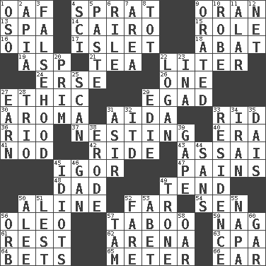 ACROSS 1. Clumsy lout 4. Small fatty European fish 9. Northwest Algerian city 13. Health resort 14. Capital of Egypt 15. Hero or heavy, e.g. 16. Lubricate 17. Small island 18. Blind as ____ 19. Cleo's killer 21. Afternoon social gathering 22. 61 cubic inches 24. Celtic language 26. Single 27. Value system 29. Mild oath 30. Odor 31. Opera by Verdi 33. To free from 36. River (Sp.) 37. Nestling 40. Period 41. Lower and raise head in agreement 42. Travel on or in a vehicle 43. Slender Brazilian palm 45. Composer Stravinsky 47. Aches 48. June honoree 49. Look after 50. Place in a line 52. At a great distance 54. Elected rep. 56. Butter sub 57. Off limits 59. Tired old horse 61. Relief 62. Sports stadium 63. Tax preparer (abbr.) 64. Antes 65. Distance measurement 66. Ewer handle DOWN 1. Bear (Spanish) 2. Capital of Western Samoa 3. It jiggles the polygraph 4. _-fi 5. Thick mixture 6. Cause heat under the collar 7. Length times width 8. Small child 9. Spoke pompously 10. Loose flowing garment 11. Having or resembling wings 12. Fish or hair follower 20. Demure 22. Utah city north of Ogden 23. _ tizzy (2 wds.) 25. Skim 27. Merit 28. Musical group of three 29. Singer Brickell 31. SW Saudi Arabia district 32. It would 33. Dwelling 34. SW Asia republic 35. Raised platform 38. Eat (away) 39. Open wide 44. Without 45. Foolish or stupid persons 46. Separate the seeds from cotton 49. Marketplace scale 50. Toward shelter 51. For fear that 52. Conductor's collection 53. Collude with 55. California wine valley 56. Globe 57. Scottish cap 58. Boat paddle 60. Slender fish